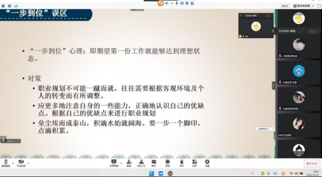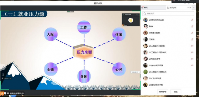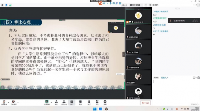 党的二十大报告提出“实施就业优先战略。就业就是最基本的民生。强化就业优先政策,健全就业促进机制,促进高质量充分就业。”高校毕业生就业是做好就业工作的重中之重。为帮助毕业生积极树立正确的就业观念,全面提高学生心理素质,促进学生健康成长,从容应对就业压力,完成就业心理调整,顺利就业。粮油食品系·建筑与艺术设计系—“新晴驿站”心理成长辅导站于2022年12月12日晚7:00在腾讯会议开展了一场“大学生就业之心理调适”的线上心理讲座。本次讲座由系“新晴驿站”心理成长辅导站心理负责人熊莉主讲,本系20级心理委员及每班4名学生代表参加此次讲座,由系心理部负责组织。