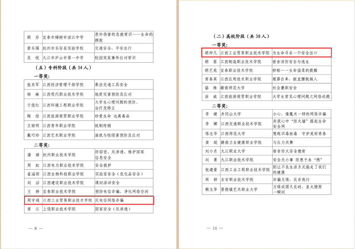 近日,2022年江西省大中小学公共安全教育骨干教师教学能力展示活动圆满落幕。江西工业贸易职业技术学院在比赛中再创佳绩,安全保卫处胡仲凡老师的展示作品《为生命寻求一个安全出口》获管理人员组高校阶段一等奖,旅游商务系周宇珑老师的展示作品《反电信网络诈骗》获教师组专科阶段二等奖。