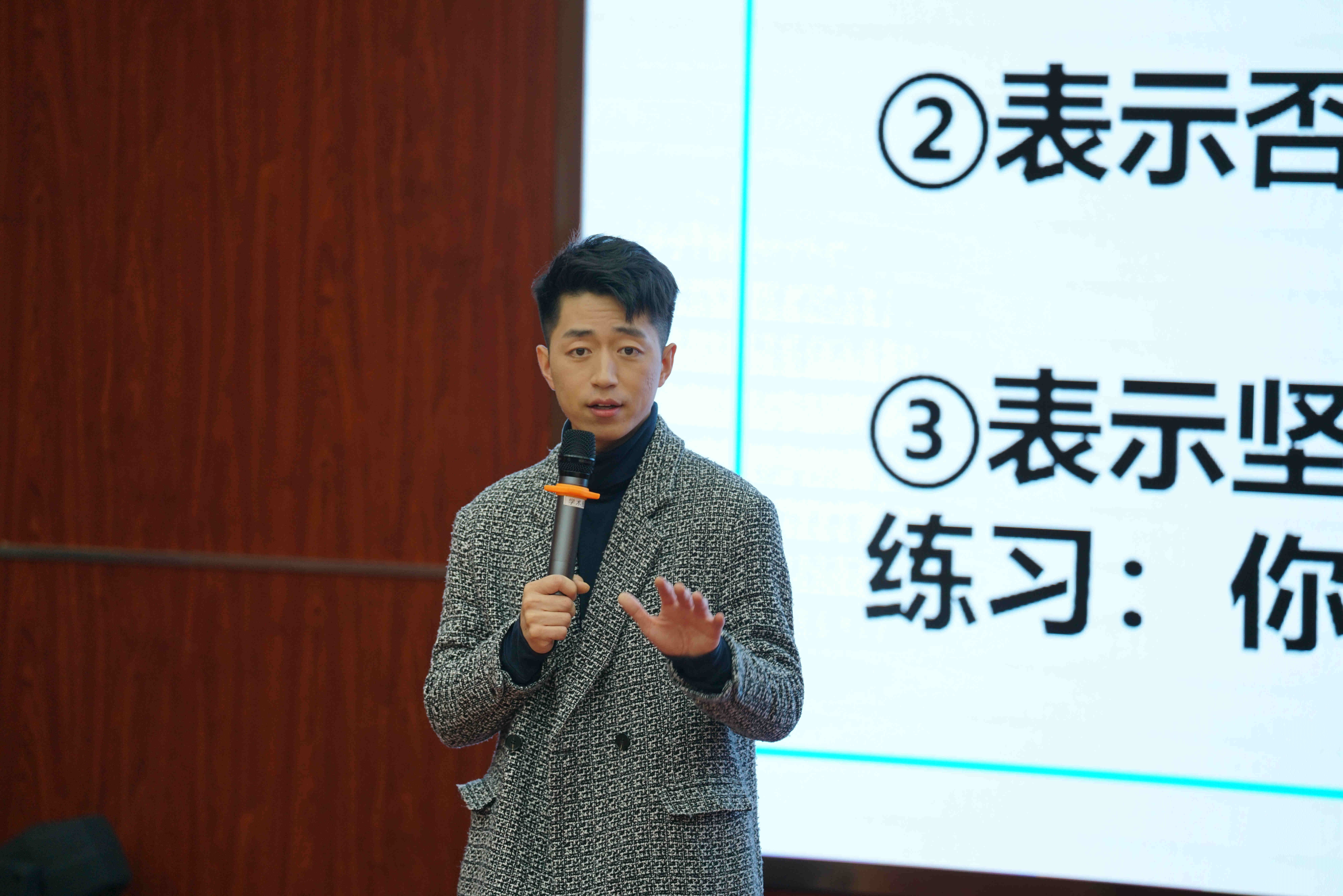 讲座现场,范亮老师围绕“从学技巧、用技巧到丢技巧、藏技巧,如何实现真感受——语言重塑的实践旅程”主题,结合自身经历,用轻松愉悦的方式进行现场教学,从播音员主持人必备的六种能力讲起,通过“停连”“重音”技术的运用,向关注“语气”“节奏”两个外部技巧转移,在朗读过程中要摒弃“习惯性积极表达”“习惯性朗诵腔”“习惯性断句”“习惯性给重音”“习惯性新闻腔”等习惯,应归回思想感情的感受层面,从情景再现、对象感、内在语三个内部技巧,对语言文字展开深刻理解、充分想象和具体感受,从而使有声语言表达更加生动传神。范亮老师表示,艺术来源于生活,我们的感受力要从生活中的点滴小事汲取。通过提气,表情、手势、姿势不断变化等方法提升主持技巧,达到理论与实践的巧妙结合。