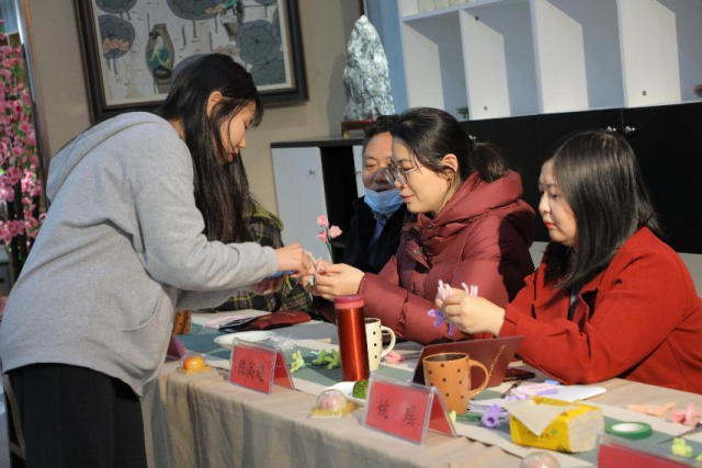 在场辅导员通过耳朵听了五粮文化深厚之美,眼睛看了传统服饰精致美,心中也感悟了我们的传统文化之美,接下来辅导员们通过制作绒花感受心灵手巧之美。