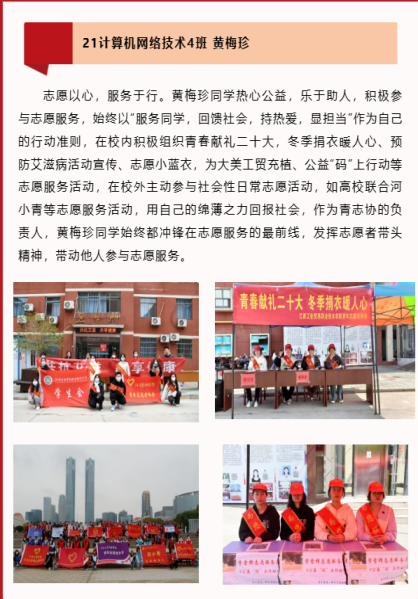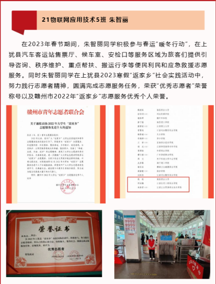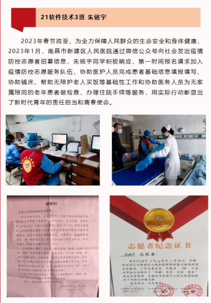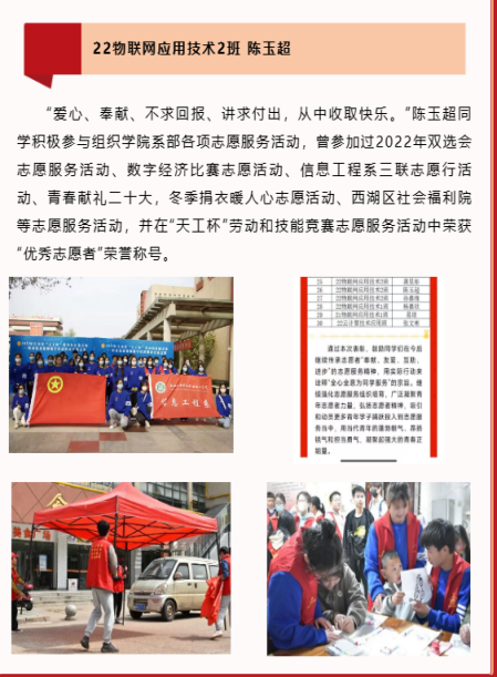 3月21日信息工程系为积极挖掘树立班级志愿者典型,通过推荐第十一届江西省青年志愿服务先进典型和表彰2022年学院青年志愿服务优秀个人和先进组织,我系结合个人申报材料事例,综合评选,推选出“十佳志愿者”,鼓励和引导了广大青年学子以青年热情引领时代新风尚,争做服务社会的前行者、引领者。