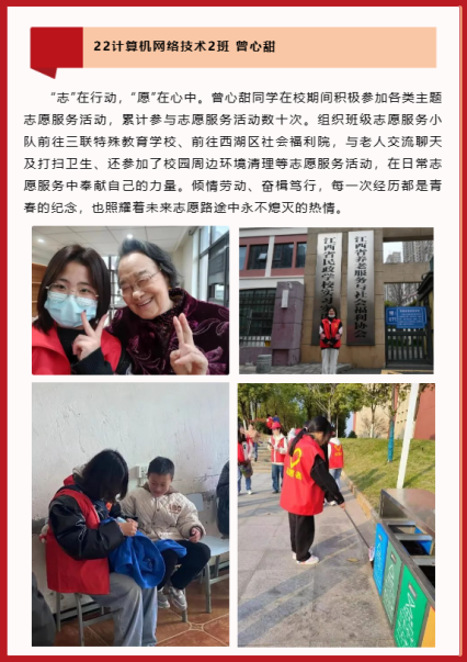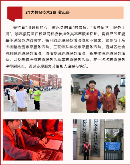 为全面贯彻党的二十大精神,落实青年志愿者行动,铭记习近平总书记“让雷锋精神在全社会蔚然成风,世世代代弘扬下去”的重要指示精神,信息工程系开展“学习二十大,青春志愿行”雷锋月系列活动。活动开展以来,信工青年积极投身各类志愿活动,让雷锋精神在校园闪光,让志愿服务在校园绽放,将雷锋精神贯彻日常,写入内心。