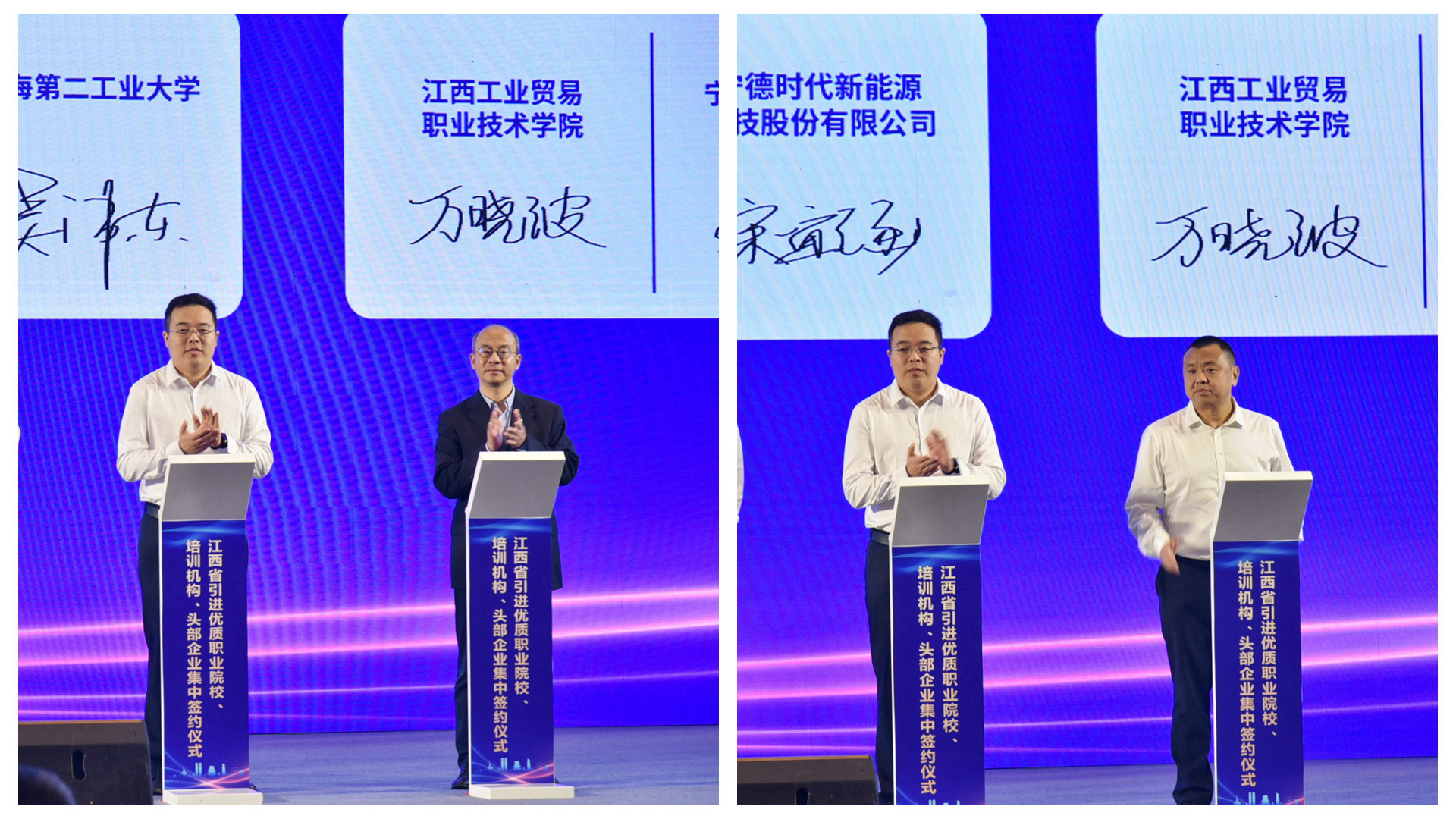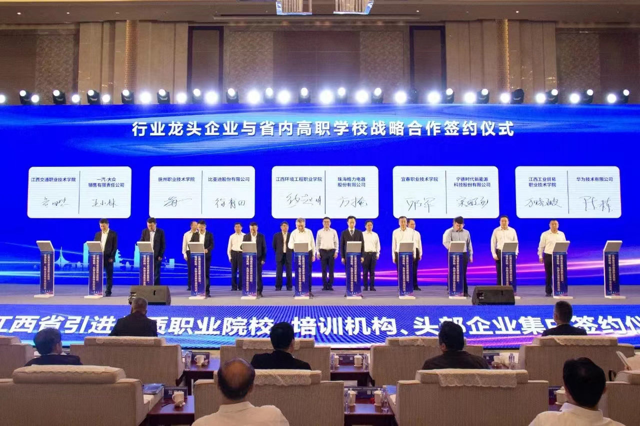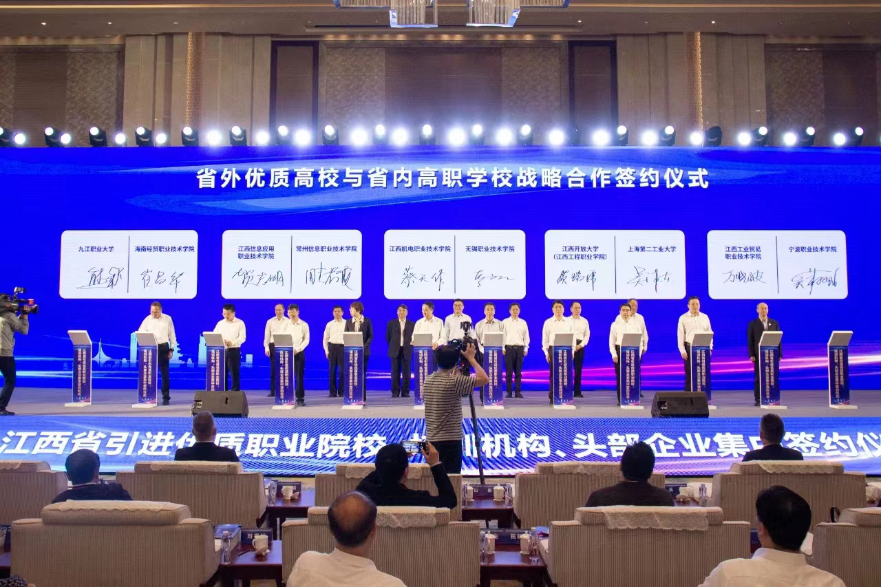 签约仪式上,万晓波代表学院与10所省外优质职业院校中的宁波职业技术学院签订校校共建战略合作协议;与10所行业龙头企业中的华为技术有限公司签订校企战略合作协议。通过与省外优质职业院校、行业龙头企业开展合作办学、建设实训基地、开展职业培训、服务人才引育用等,将提升学院职业教育与产业发展的适配度和融合性,助推学院“双高计划”建设,为加快打造部省共建国家职业教育创新发展高地,培养更多服务产业高质量发展的“赣鄱工匠”和“能工巧匠”贡献更多工贸力量。