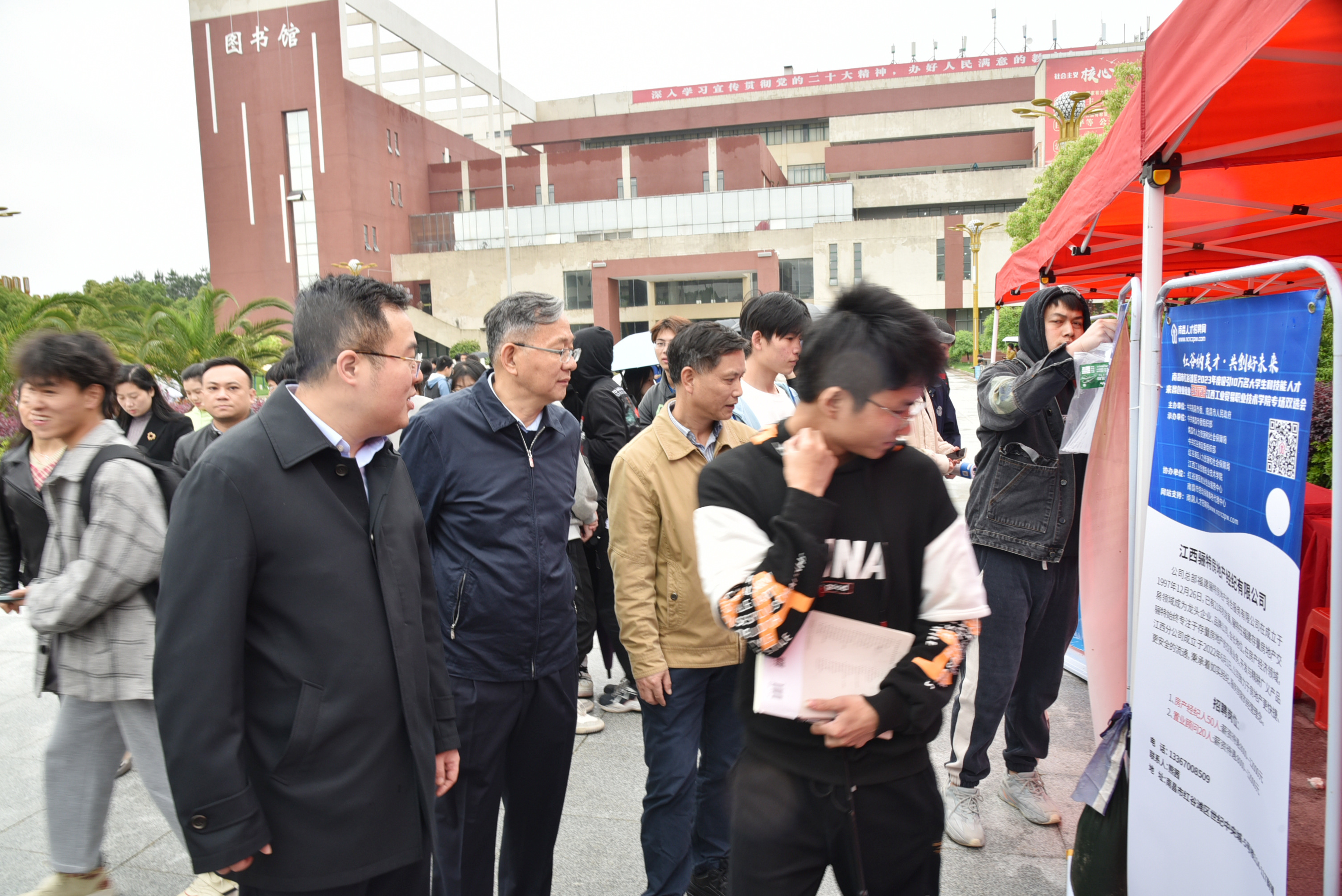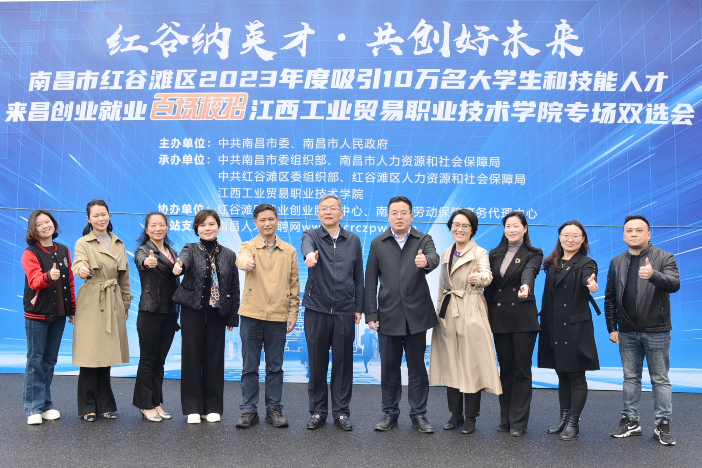 4月23日,学院在南广场举办红谷纳英才·共创好未来——南昌市红谷滩区2023年度吸引10万名大学生和技能人才来昌创业就业百场校招江西工业贸易职业技术学院专场双选会。本次双选会由中共南昌市委、南昌市人民政府主办,中共南昌市委组织部、南昌市人力资源和社会保障局、中共红谷滩区委组织部、红谷滩区人力资源和社会保障局、江西工业贸易职业技术学院承办,红谷滩区就业创业服务中心、南昌市劳动保障事务代理中心协办。红谷滩区副区长吴梅萍、红谷滩区人社局局长刘红霞莅临学院双选会现场,学院党委书记万玉青、院长万晓波、院长助理艾苏龙、就业创业学院主任万颖和各系主任、分管就业副主任赴双选会现场指导。