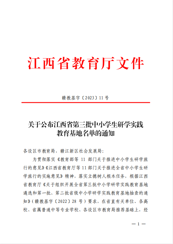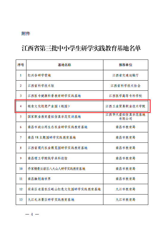 近日,江西省教育厅公布了江西省第三批中小学生研学实践教育基地名单,经严格推荐遴选,专家评议并公示,江西工业贸易职业技术学院粮食文化创意产业园(粮园)获批江西省第三批中小学研学实践教育基地。