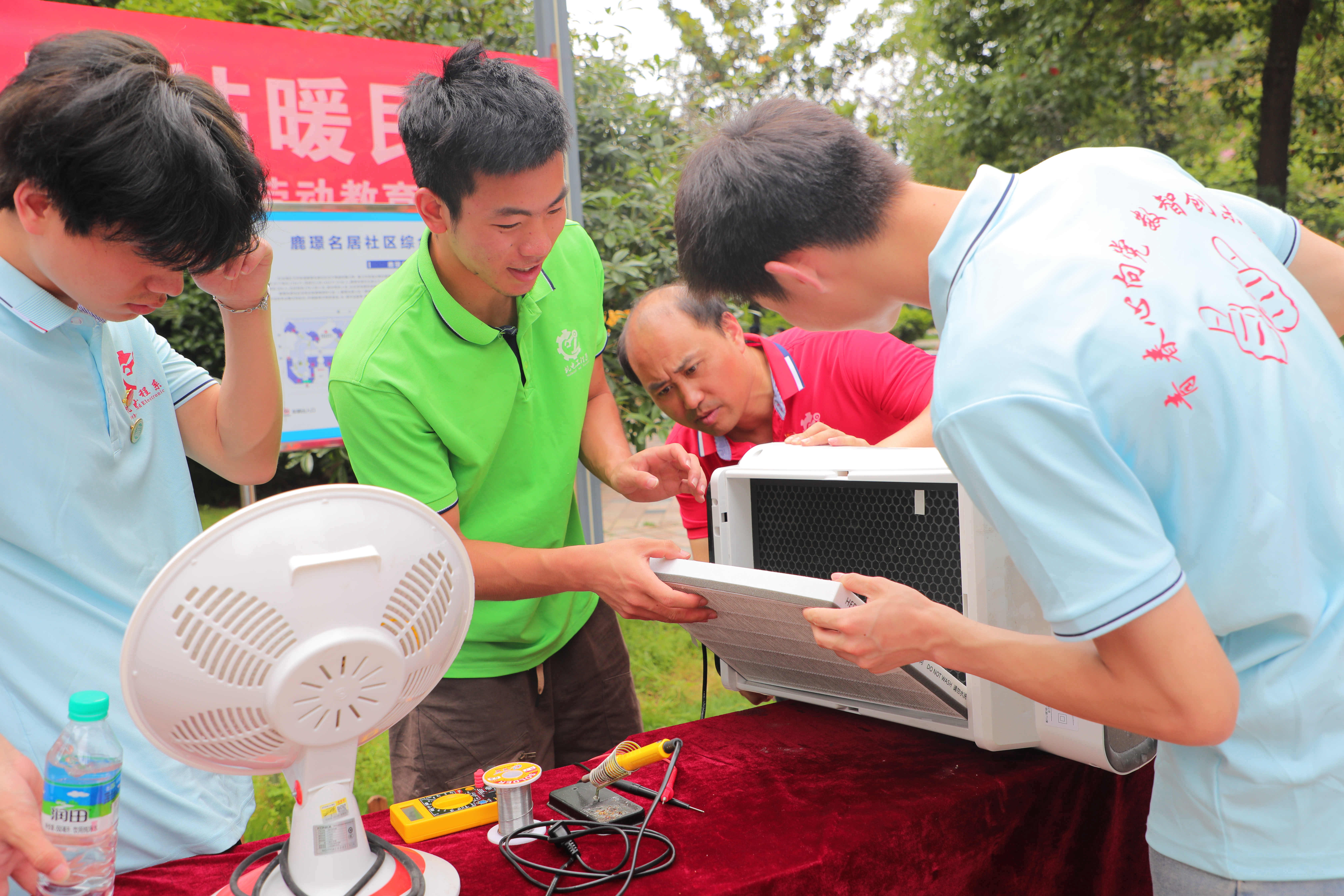 在社区中门,由支部党员和入党积极分子组成的实践团,将智能机器人作品、红色3D数控打印作品、机械创新大赛作品展示在社区居民必经之路,同时设立了红色维修驿站,提供家电免费维修服务,受到了居民的驻足参与。