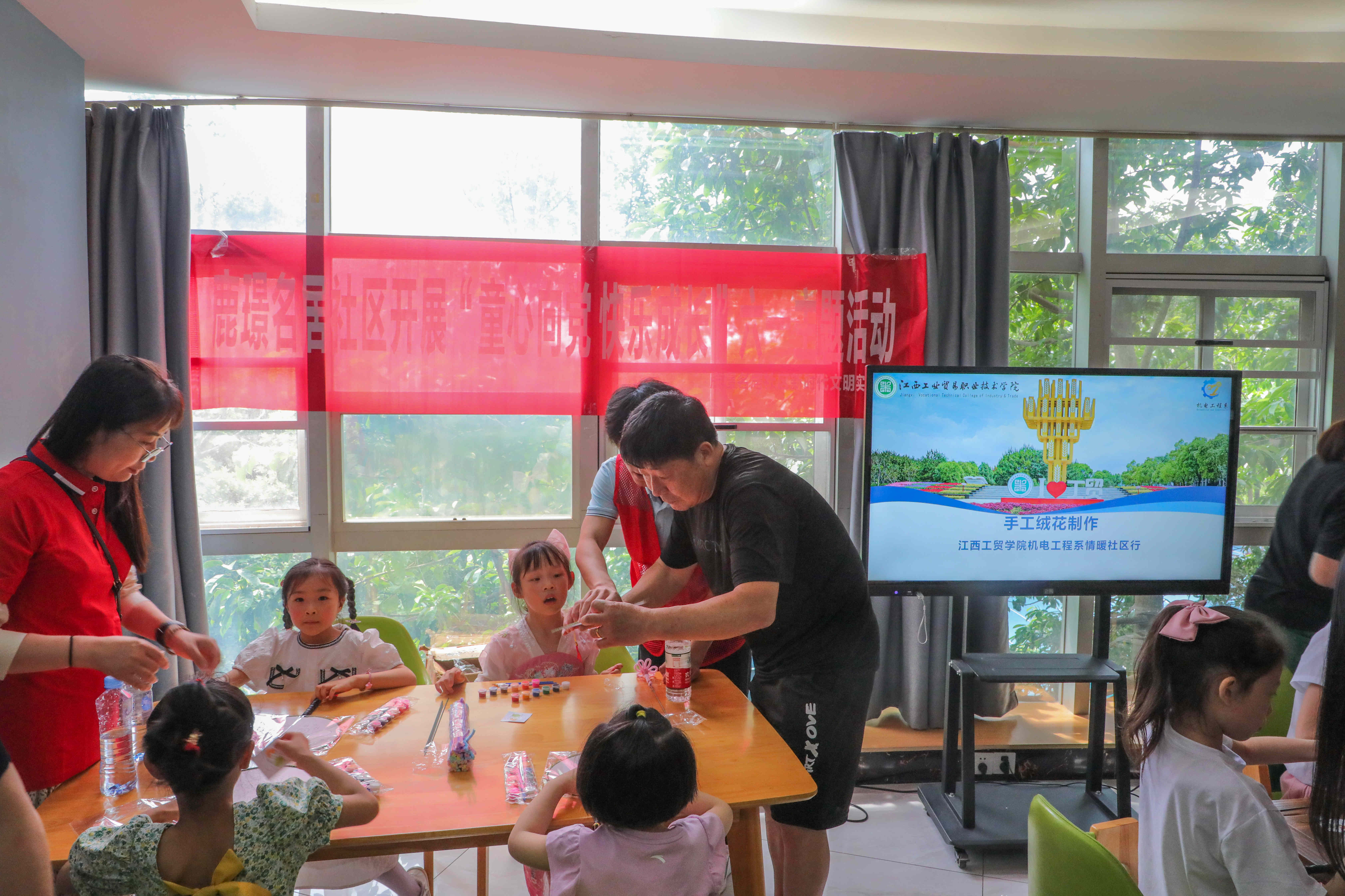 机电工程系支部党员陈高超、徐悦欣老师及学院基层党校第65期学员为红谷滩鹿璟名居社区儿童进行中国传统文化团扇、绒花手工制作,社区小朋友们在机电师生的带领下,感受着传统手工制品的无限魅力。