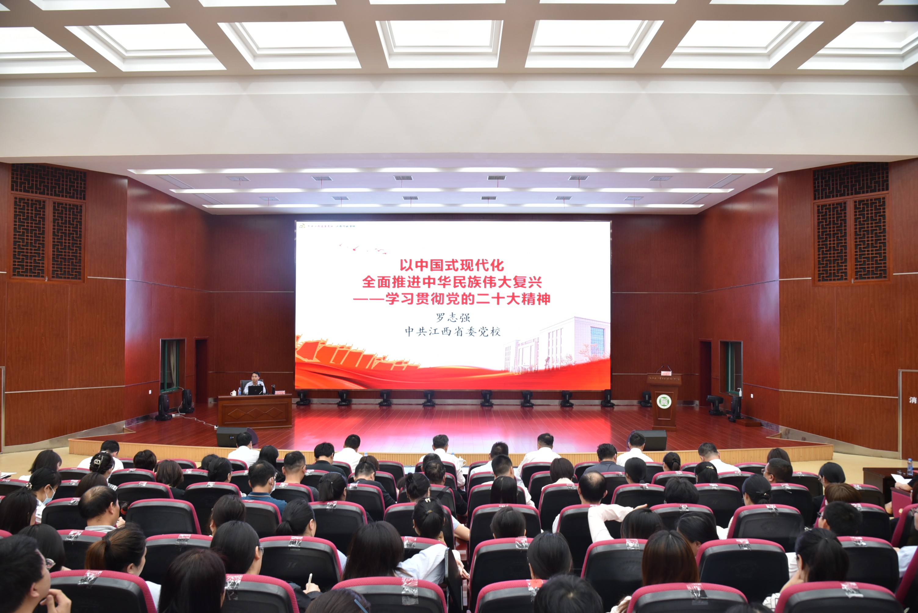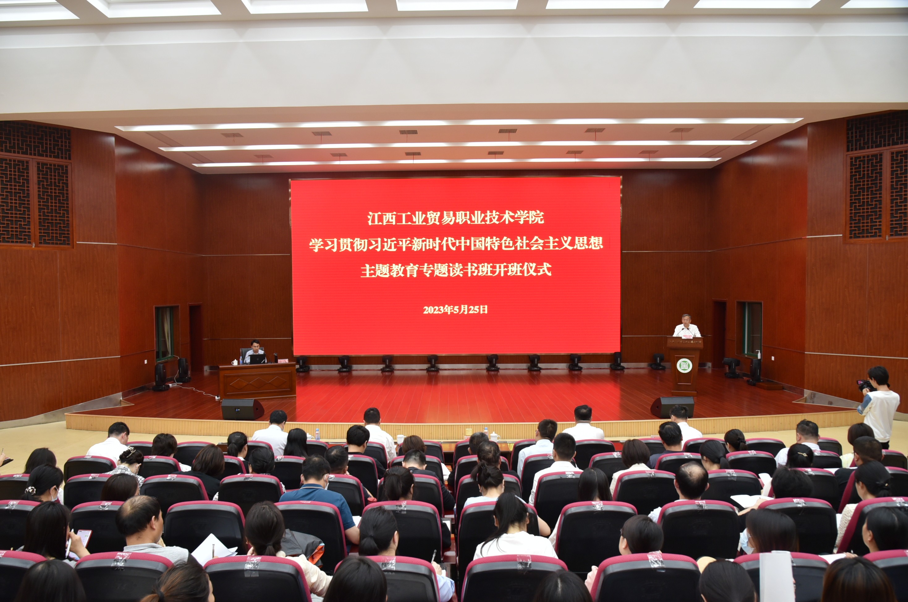 5月25日下午,江西工业贸易职业技术学院在图书馆学术报告厅举行学习贯彻习近平新时代中国特色社会主义思想主题教育专题读书班开班式。学院党委书记、学院主题教育领导小组组长万玉青主持开班式并作开班动员讲话。省委党校罗志强副教授作现场专题宣讲。学院党委副书记、院长万晓波,党委委员、纪委书记何锐,党委委员、副院长宋小兵,党委委员、院长助理艾苏龙,全体党员及老同志、学生党员代表参加开班式并聆听辅导报告。