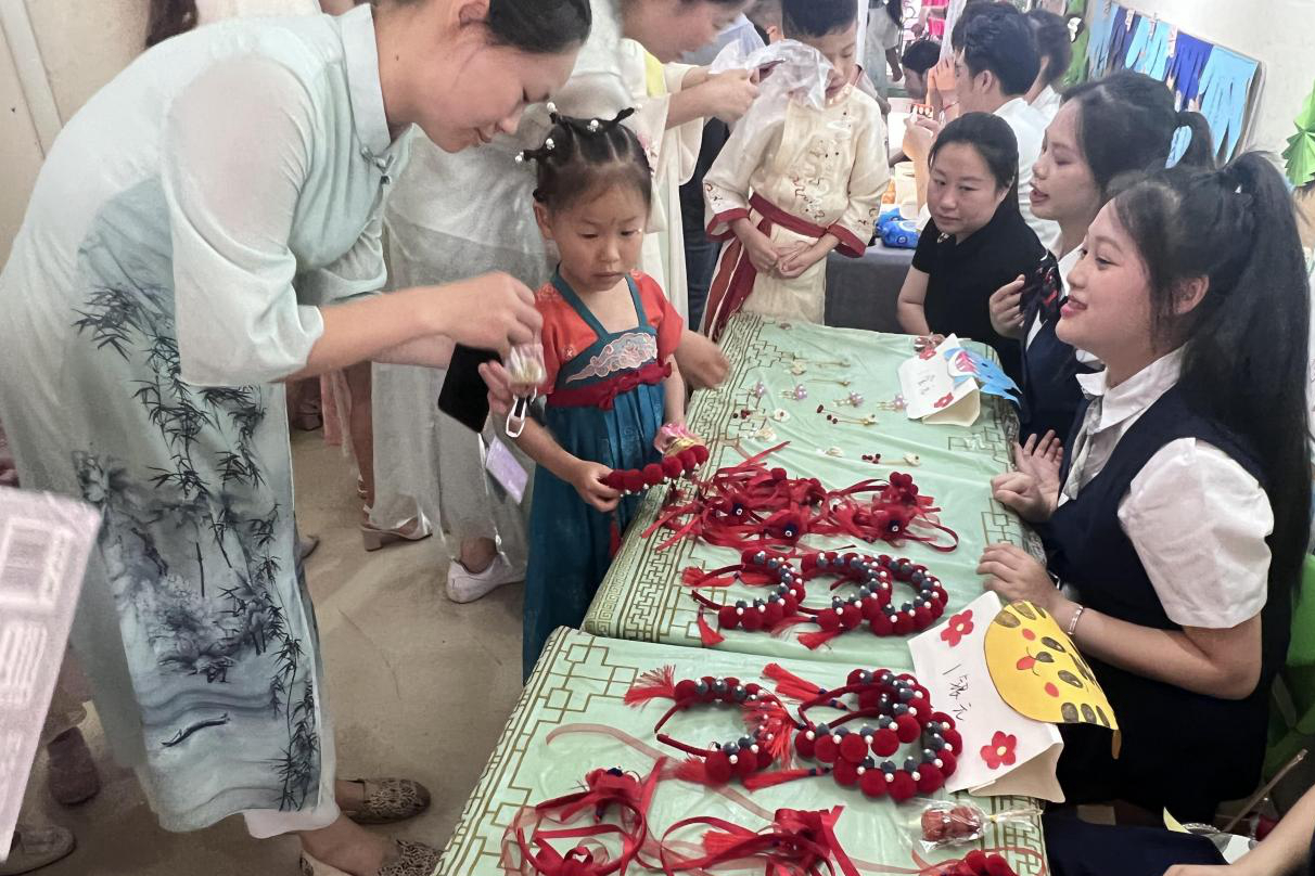 几十个摊位瞬间把幼儿园排得满满当当,“爱心义卖活动”就这样开场了。义卖活动种类繁多,有书籍书刊、玩具小汽车、自制食品等等。爱心义卖活动中工贸职院共有:水果糖葫芦、茶艺表演及手工饰品展三个摊位。幼教专业学生志愿者们将古风主题手工制作的手工发箍,手环,团扇等陈列出,一经展出,前来购买的客人就络绎不绝。香香甜甜的糖葫芦也深得孩子们的喜爱,摊位前面越来越多的人,到最后供不应求。