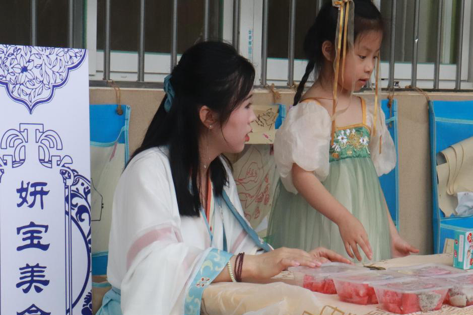 义卖活动开始,家长和小朋友们都穿上了符合“六一古装游园”主题的服饰,工作人员解释换算规则,只能用现金兑换,不找零,且现金一旦兑换不能退还,铜币1元兑一个,银元5元兑一个,金元10元兑一个。各班级幼儿与家长做好前期准备,为店铺取名字及制作展架,想好广告词并制作价格标签等。
