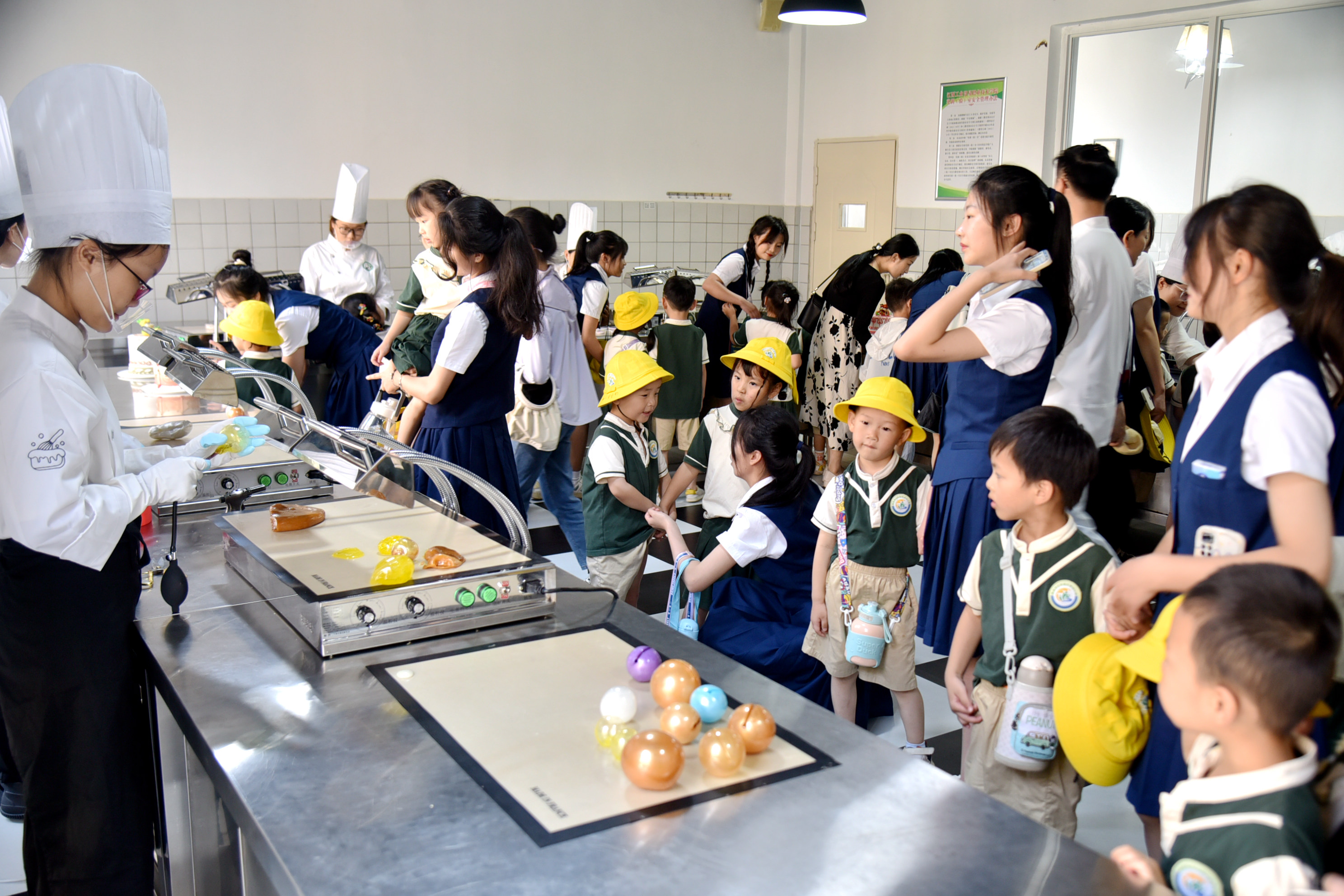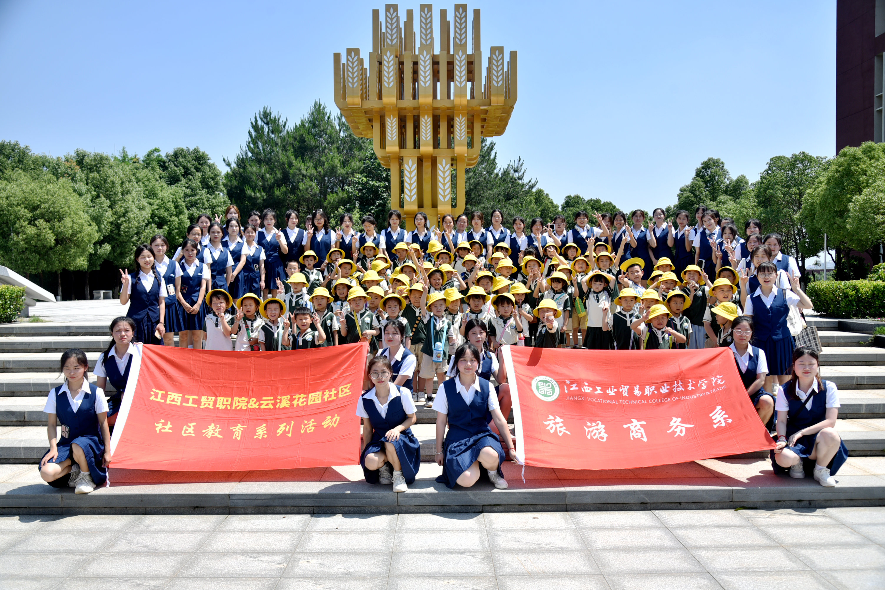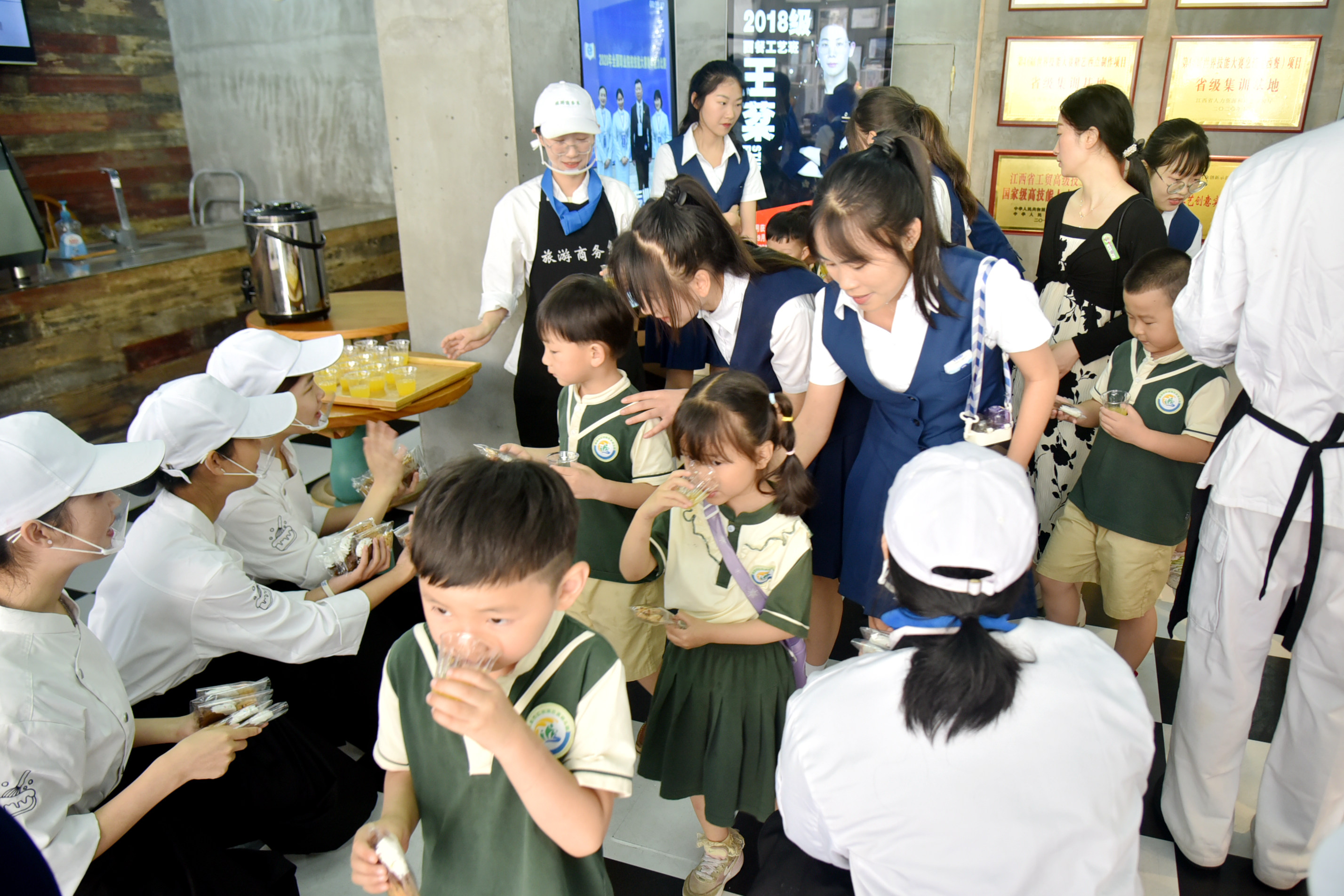 6月9日,南昌市红谷滩区云溪幼儿园3个中班的小朋友们来到江西工业贸易职业技术学院开展劳动教育研学实践活动。在老师和家长代表以及志愿者们的带领下,小朋友们游览粮食文化主题公园,参观粮园和西点烘焙实训中心,近距离观摩丰富多彩的粮食画和糖艺作品、糖果蛋糕制作技艺,感受劳动创造美好的魅力。
