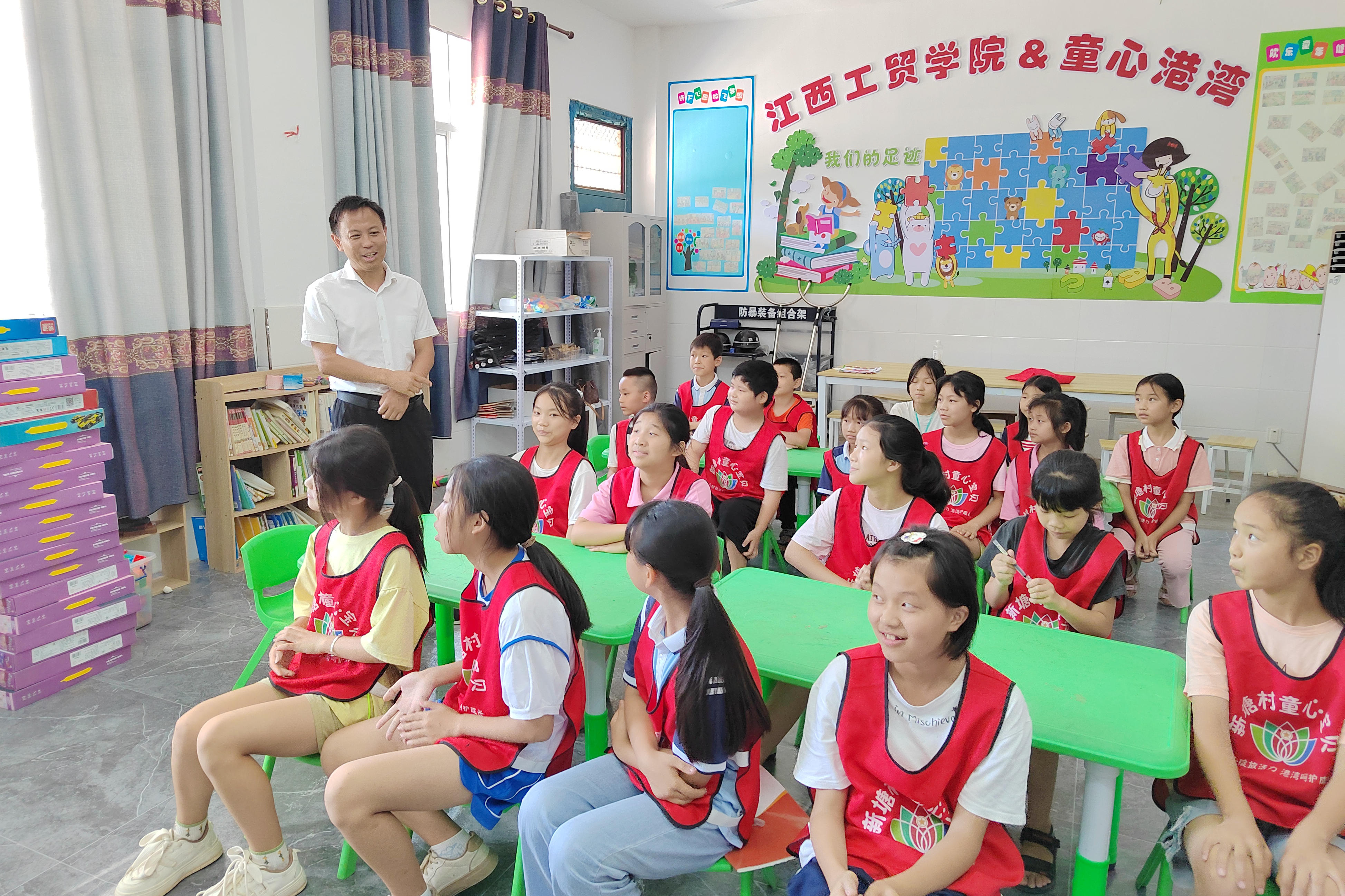 刘国红一行第一站直接走进童心港湾项目点,看望留守儿童们,勉励孩子们要树立远大志向,认真学习知识,听党话、感党恩、跟党走,爱祖国、爱人民、爱父母、爱家乡,不负美好时光,努力成长为能够担当民族复兴大任的时代新人,同时嘱咐驻村工作队要依托学院优势,完善关爱服务体系,帮助留守儿童健康成长。学院团委罗慧敏、黄雅萍两位老师现场与小朋友们互动交流,结合庆祝七一活动用歌唱红色、智力游戏、舞蹈碰队的方式,带小朋友们走进红色的、温暖的、有情的世界,鼓励孩子们传承红色基因,传播红色文化。