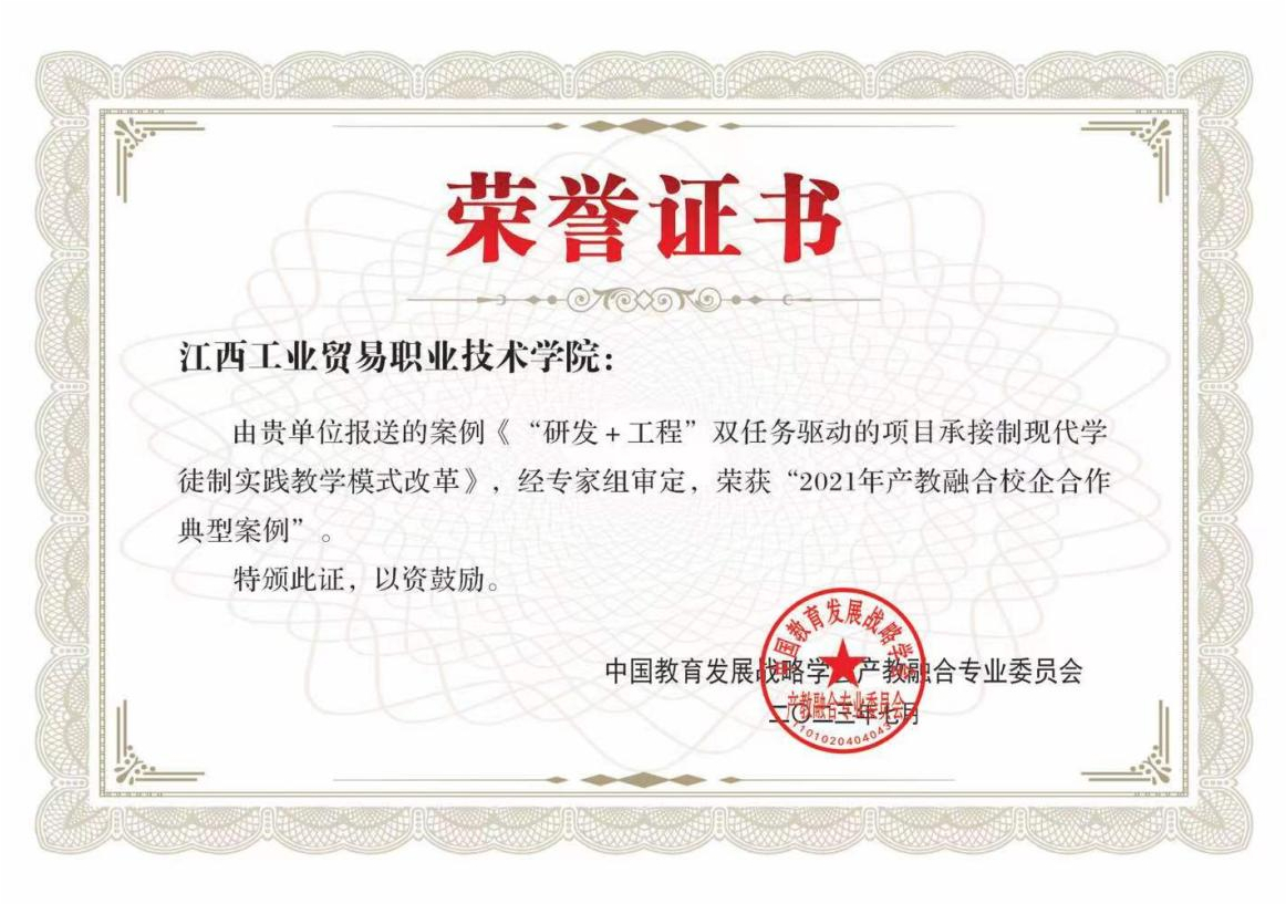 开幕式上发布了《2023产教融合专委会课题立项指南》《中国产教融合校企合作典型案例研究报告》以及《2021-2022产教融合校企合作典型案例100篇》,并启动了“2023产教融合校企合作典型案例”征集工作。江西工业贸易职业技术学院选送的《“研发+工程”双任务驱动的项目承接制现代学徒制实践教学模式改革》案例,荣获“2021年产教融合校企合作典型案例”。