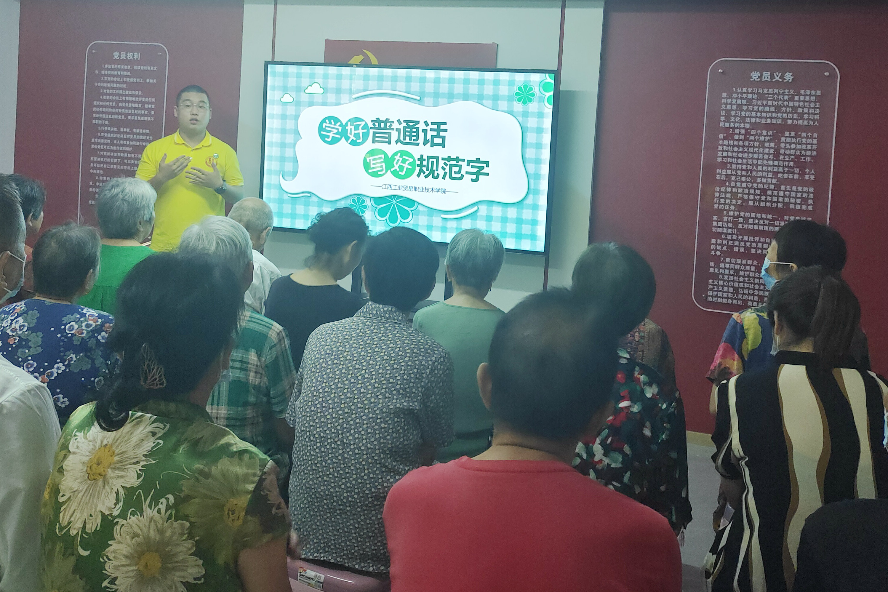 学院经济贸易系“薪火队”走进九江市濂溪区青年路社区服务中心,为社区老人开展“学好普通话、写好规范字”的主题宣讲活动,实践队讲解员与居民拉近距离,详细讲解讲好普通话的重要性和实用性,倡导居民说文明之语,写规范之字,营造学习使用国家通用语言文字的浓厚氛围。