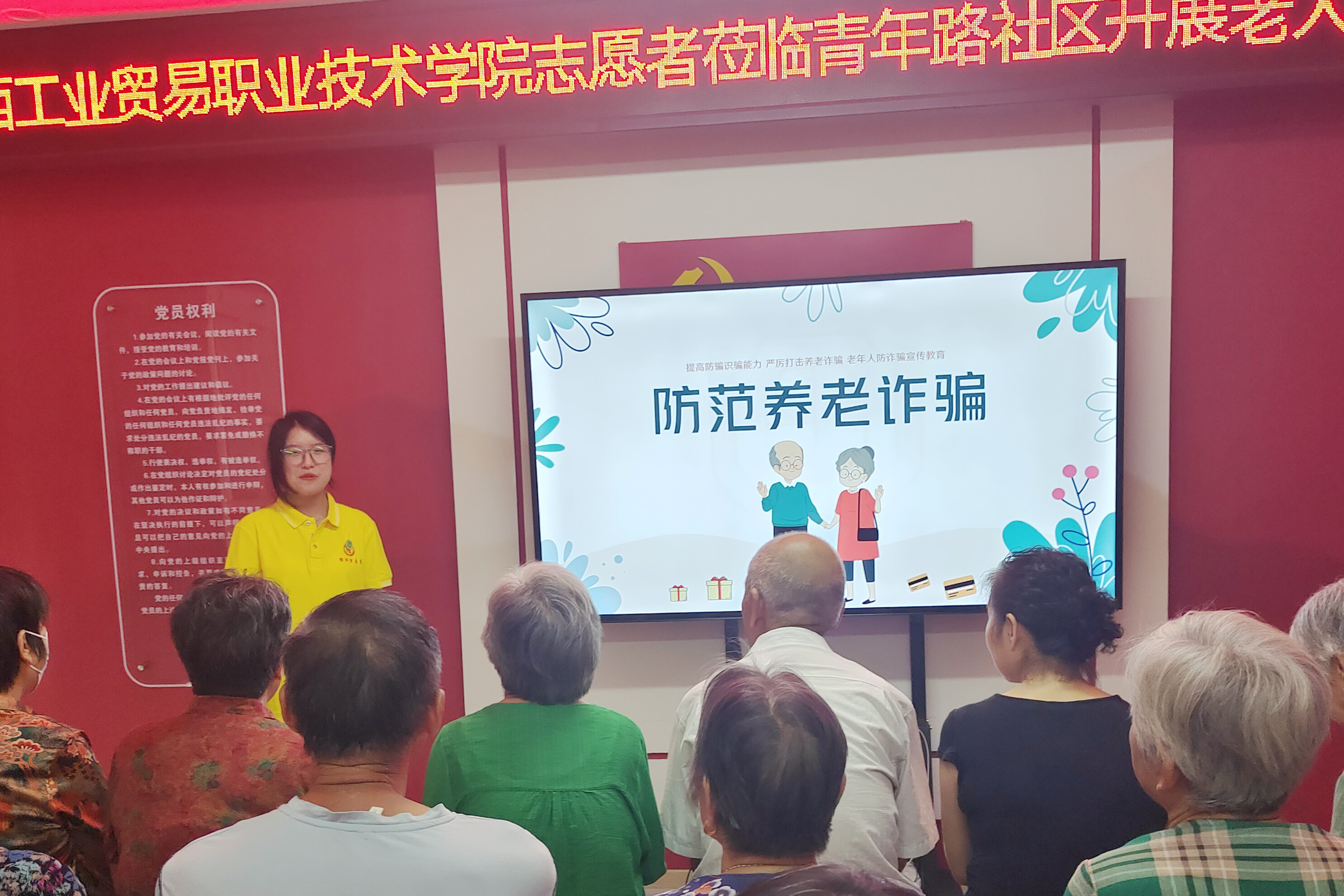 增强网络防诈意识,筑牢电信防骗堤坝,防诈知识进社区,关乎人民群众的切身利益。学院经济贸易系“薪火队”社区实践团队走进九江市濂溪区青年路社区开展反诈知识宣传。实践队队员们通过多媒体播放,声情并茂地向社区老年人介绍诈骗案例和诈骗手段,详细讲解针对老年人的诈骗圈套应如何预防,并向居民推荐下载国家反诈中心APP,为养老金多加一道反诈防线。“原来骗子的花样这么多啊,我这就来下载。”一位爷爷打开手机,在队员的帮助下下载了国家反诈中心APP。同时提醒现场老年人遇到诈骗行为要及时向有关部门举报,挽回财产损失,此次宣讲活动有效增强了老年人的防范意识,提高辨别诈骗手段的能力。