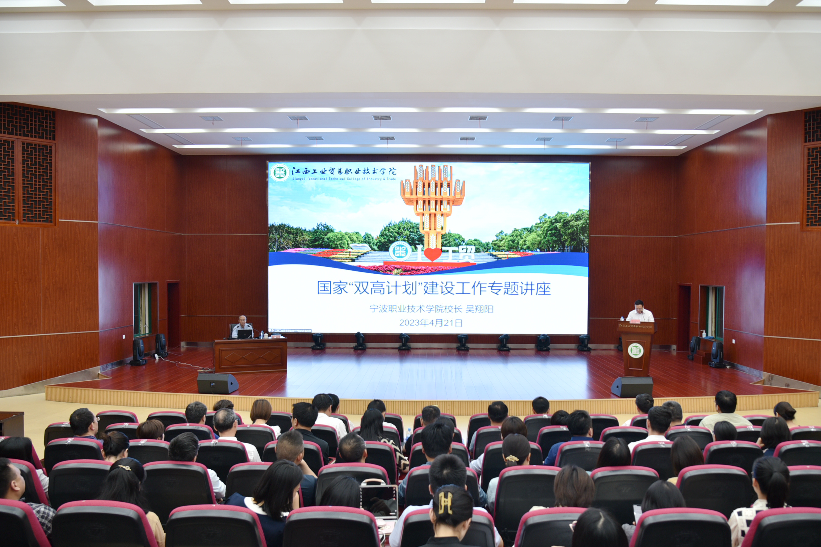为统一思想、提高认识,以先进理念引领高质量发展,更好地推动学院“双高计划”建设工作,4月21日下午,学院特邀宁波职业技术学院校长吴翔阳教授围绕国家“双高计划”建设在图书馆学术报告厅作专题讲座。学院党委副书记、院长万晓波,党委副书记彭锐,党委委员、副院长刘国红、胡晖,党委委员、院长助理艾苏龙,全体教职工现场聆听专题讲座。