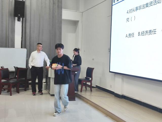 为检验大家学习成果,现场开展“防范非法集资,远离金融诈骗”应知应会问答,用以答促学的形式,增强同学们对非法集资、金融诈骗风险的防范意识和辨别能力。同学们现场踊跃互动,积极举手回答问题,并领取小礼品。