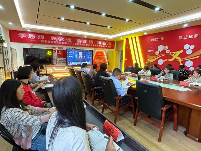 会议的第一个环节:经济贸易系党支部组织全体教职工观看“奋力谱写中国式现代化江西篇章——习近平总书记在江西考察重要讲话引发干部群众热烈反响”视频。