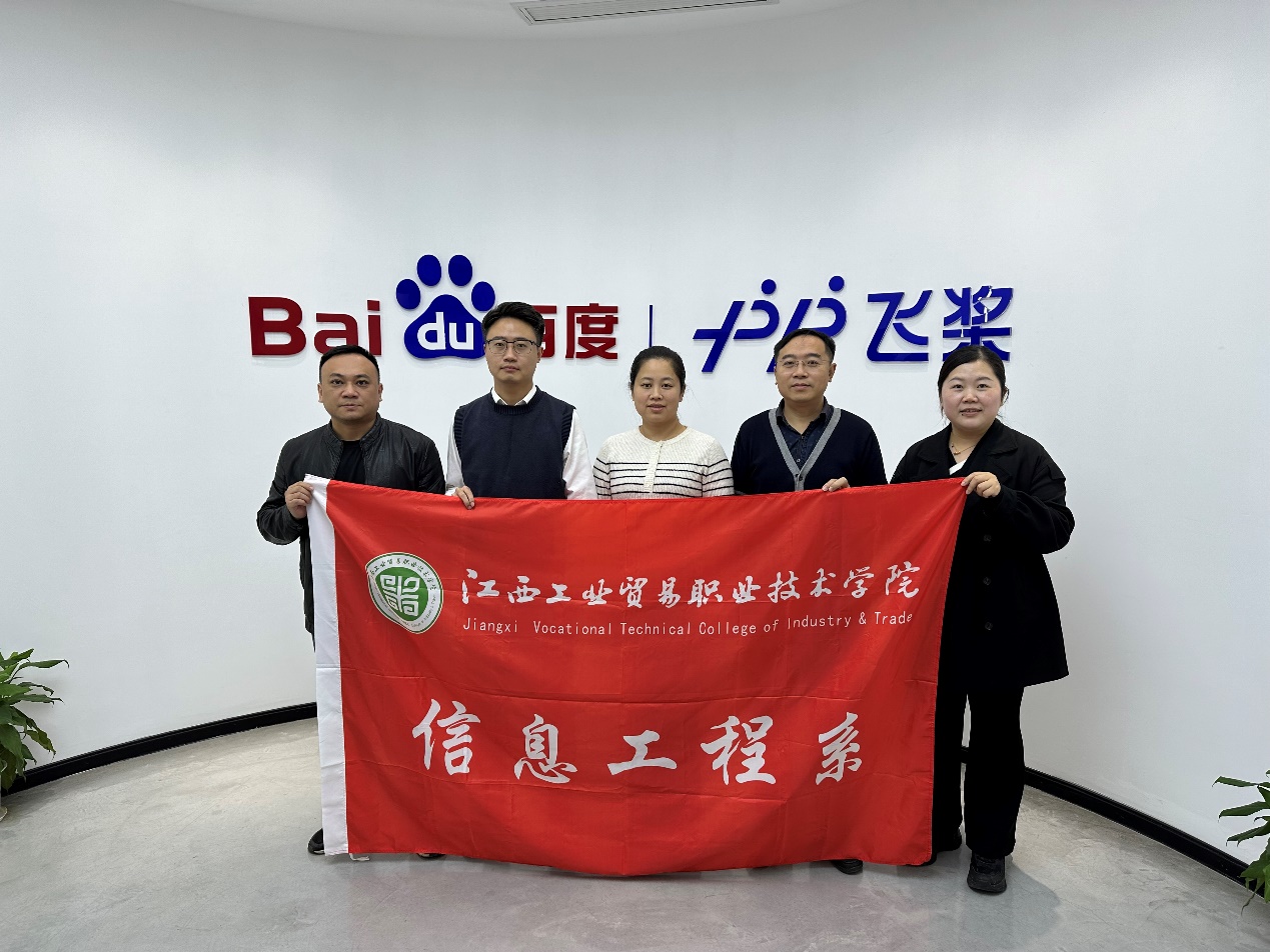 为积极贯彻落实“访企拓岗促就业”专项行动,深化产教融合、加强校企合作,不断提升人才培养质量以及综合办学水平,11月29日上午,江西工业贸易职业技术学院信息工程系党支部书记、系主任夏昕,党支部副书记、教学副主任熊浩,数字经济教研室主任周斯昱前往百度飞浆(江西)人工智能产业赋能中心,实地调研赋能中心的基本情况、技术和人才需求等情况,为毕业生开拓就业渠道和就业资源,推动校企合作走深走实。
