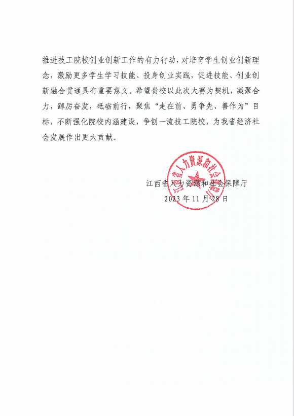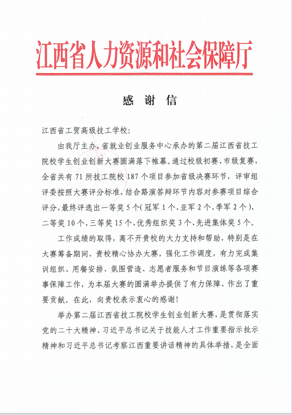 江西省人社厅发来感谢信!点赞学校协办创新创业赛事工作