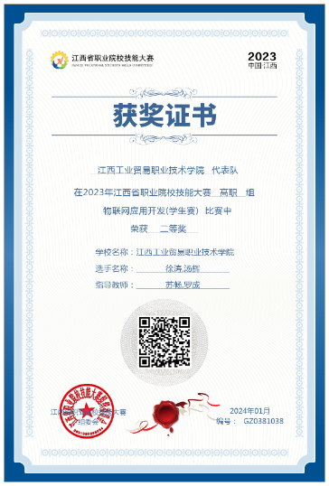 随着2024年1月15日江西省职业院校技能大赛“物联网应用开发”赛项在南昌圆满落幕,学院物联网应用技术专业参加的2023年江西省职业院校技能大赛相关赛项全部结束,在各项比赛中,师生团队共同拼搏、努力奋斗,最终取得了三个二等奖的好成绩,相关赛项分别是物联网应用开发(第三名)、5G组网与运维(第二名)、工业互联网集成应用(师生同赛、第二名)。