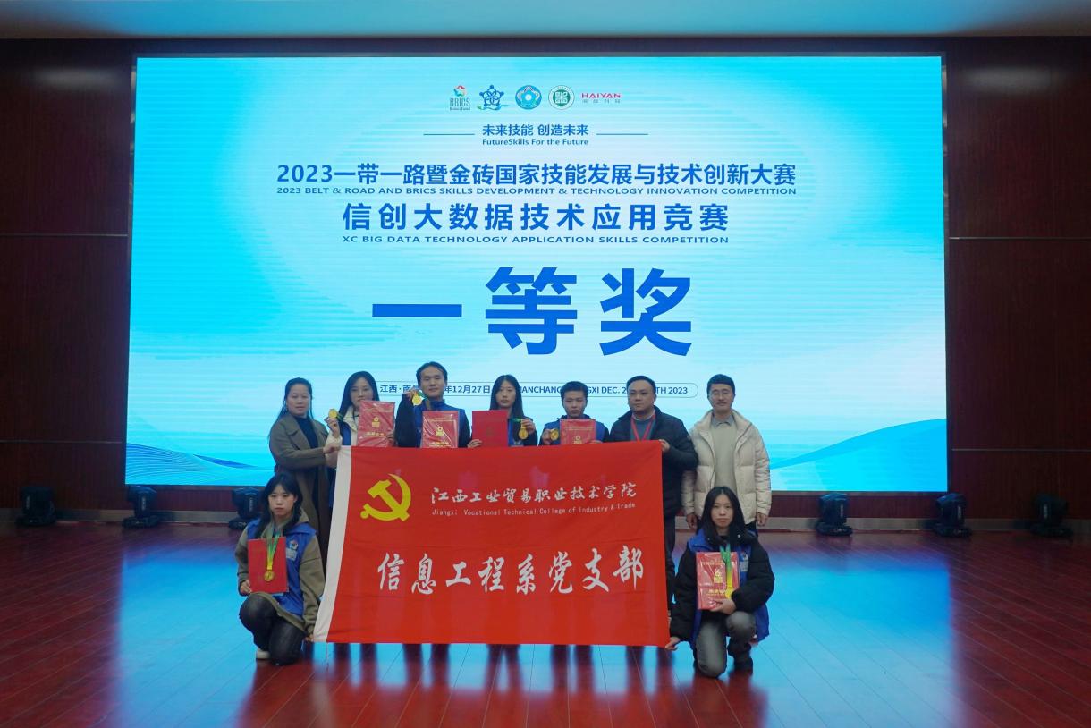 2023年12月27日至28日,由金砖国家工商理事会中方理事会、一带一路暨金砖国家技能发展国际联盟、中国科协一带一路暨金砖国家技能发展与技术创新培训中心主办,江西工业贸易职业技术学院、厦门海彦信息科技有限公司、北京嘉克新兴科技有限公司联合承办的“2023一带一路暨金砖国家技能发展与技术创新大赛之信创大数据技术应用赛项”在江西工业贸易职业技术学院顺利举行。来自全国38所院校的60余支参赛队,177名参赛选手齐聚一堂,以唯美精湛的技艺、勇于拼搏的姿态,展示出了金砖国家参赛选手追求技能发展与技术创新的风采。江西工业贸易职业技术学院荣获最佳组织奖、突出贡献奖,师生参赛队荣获2023一带一路暨金砖国家技能发展与技术创新大赛之信创大数据技术应用赛项一等奖2项。