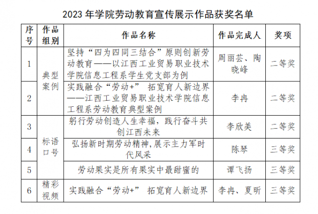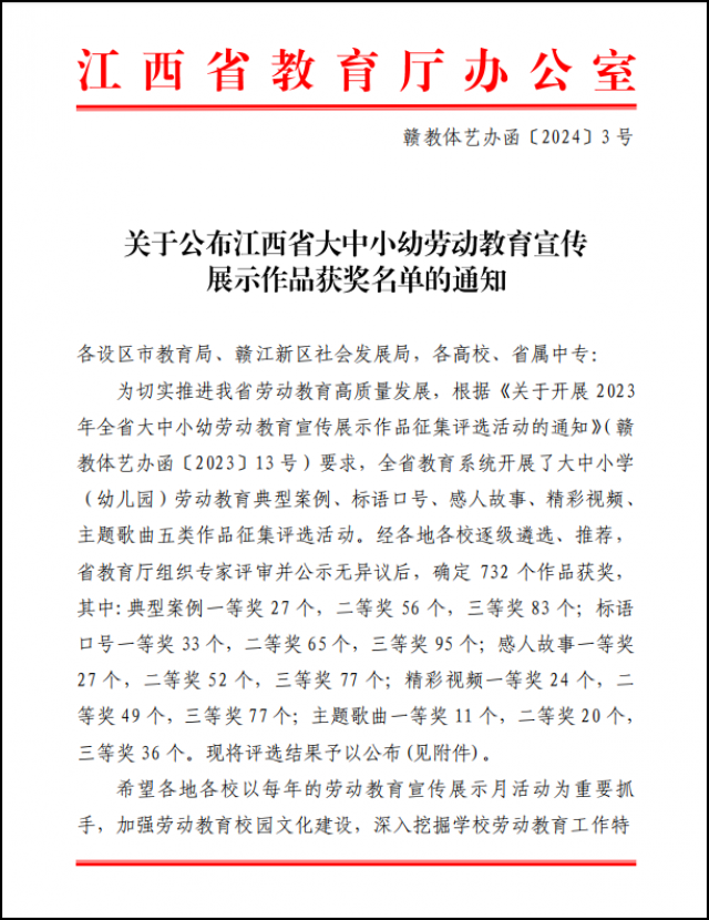近日,省教育厅下发《关于公布江西省大中小幼劳动教育宣传展示作品获奖名单的通知》(赣教体艺函〔2024〕3号),学院报送的2个劳动教育案例、3个劳动教育标语口号和1个劳动教育精彩视频成功入选。