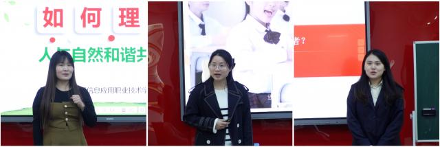 教学展示环节,来自江西信息应用职业技术学院刘慧教师、红谷滩区云溪学校曹小芳教师和江西工业贸易职业技术学院殷雨晴3位教师展示了精彩的教学片段。刘慧老师从“理论维度:如何理解马克思主义自然观;历史维度:如何继承与创新中华文明生态智慧;现实维度:如何反思人类发展之痛”三个维度,讲授“如何理解人与自然和谐共生”,指出中国坚持人与自然和谐共生,为全球生态治理贡献中国智慧和中国方案。曹小芳老师教学展示的主题是《单音与和声》,她从欣赏歌曲《稻香》导入,以挑选“融入你我、共建和谐”主题合唱比赛演出服为突破口,以问题链的形式,层层推进,环环相扣,讲清楚了个人意愿与集体规则的关系,进而在比赛现场唱响出最美和声。殷雨晴老师就“如何理解人民是历史的创造者”进行教学展示,从写下“我心中的共产党”为切入点,通过理论讲解和实例结合,讲解了人民是历史的创造者的内涵和要义,增强了对中国共产党以人民为中心根本立场的把握和理解。