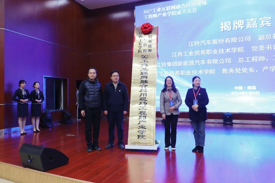 在现场热烈的气氛中,在签约三方领导、嘉宾、师生们的共同见证下,学院与江铃股份、江铃新能源共同签订了5G+工业互联网融合应用现场工程师产业学院合作协议并进行隆重的产业学院揭牌仪式,标志着校企三方共建的5G+工业互联网融合应用现场工程师产业学院正式成立!