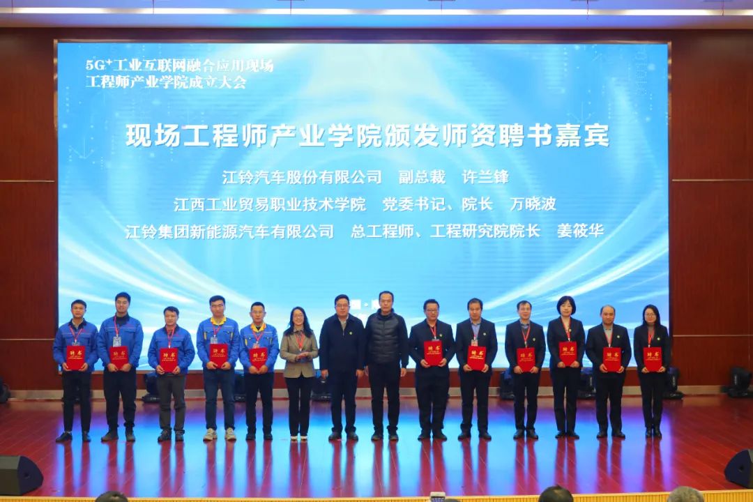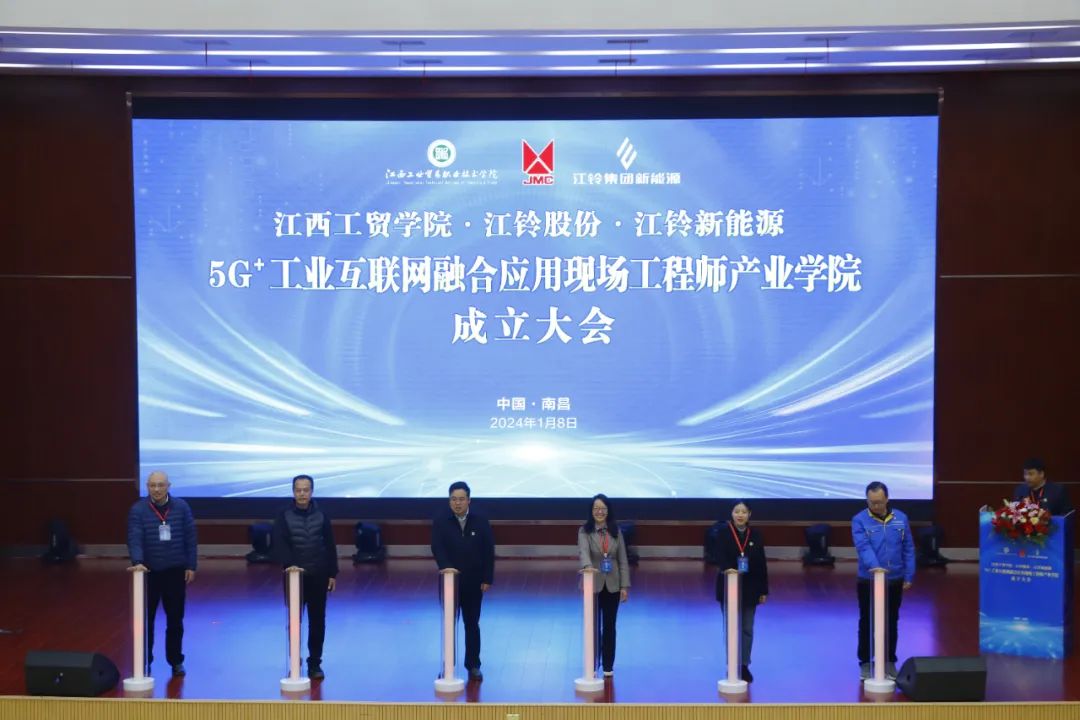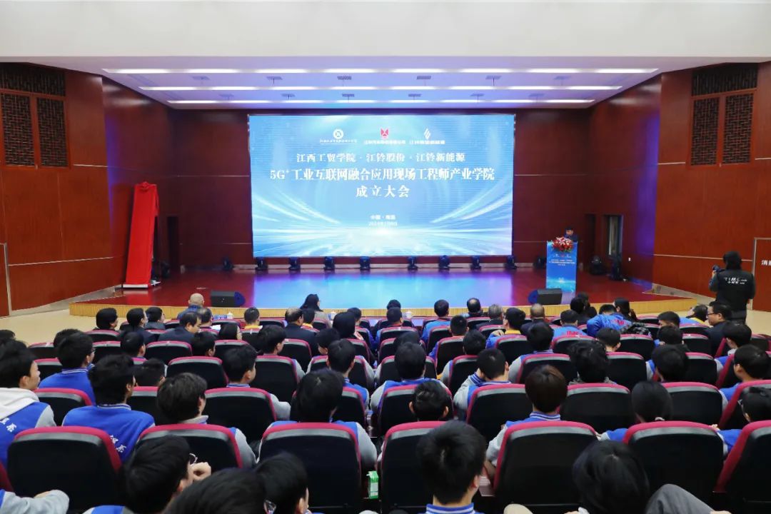 1月8日,江西工业贸易职业技术学院(以下简称工贸学院)与江铃汽车股份有限公司(以下简称江铃股份)、江西江铃集团新能源汽车有限公司(以下简称江铃新能源)在学院图文信息中心学术报告厅举行5G+工业互联网融合应用现场工程师产业学院成立大会暨第一期培养班开班仪式。学院党委书记、院长万晓波,江铃股份副总许兰锋,江铃新能源总工程师、工程研究院院长姜筱华,学院党委委员、副院长宋小兵出席成立大会,学院教务处处长、产学研培发展中心负责人曾聪,机电工程系主任马龙凤,产学研培发展中心副主任黄梅,产业学院校企导师等领导、嘉宾及学生代表共计260余人参加会议。宋小兵主持会议。