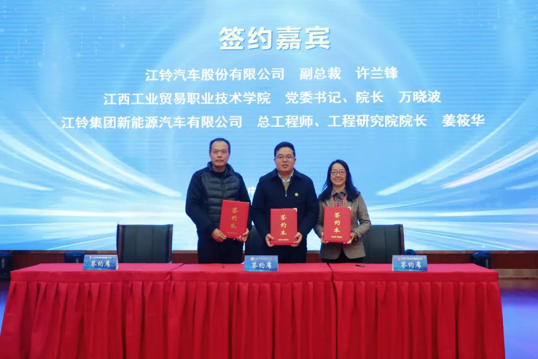 万晓波在致辞中代表学院对江铃股份和江铃新能源各位领导、嘉宾的到来表示热烈欢迎,并简要介绍了学院办学历史、规模、特色成效及近年来在持续深化现代职业教育体系建设改革进行的探索。他指出在推进产教融合、校企合作的过程中,两家企业均给予了学院大力支持,取得一系列阶段性成果,此次产业学院合作是三方深入贯彻落实现代职业教育体系建设的又一重要举措,通过强强联合、优势互补,共同开展现场工程师人才培养,不断培养高素质技术技能人才、大国工匠、能工巧匠,为构建体现江西特色和优势的现代化产业体系贡献力量。
