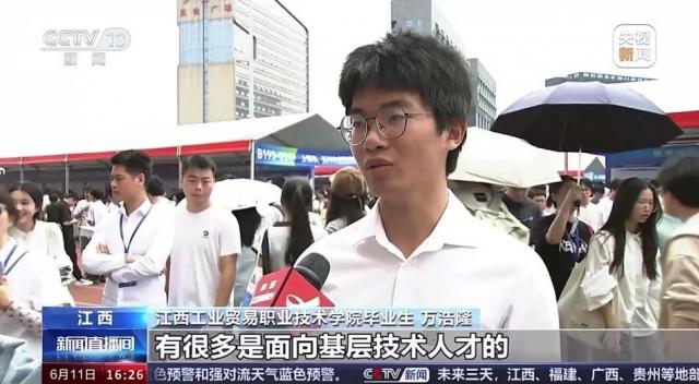 近日,“才聚江西智荟赣鄱”2024年上半年江西省人才对接招聘大会暨高校毕业生双选会在南昌大学前湖校区举行,搭建供需精准对接平台,引才留才,促进高校毕业生高质量就业。在招聘会期间,我系2021级电气自动化技术专业毕业生代表万浩隆同学接受央视新闻采访。