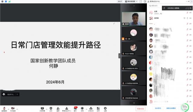 本次培训由经济贸易系国家创新教学团队精心策划和组织,安排了团队成员何静、张金连、刘陈艳三位老师担任讲师,结合当前连锁门店运营管理的最新趋势和挑战,为参训人员提供了三场实用的知识和技能,每场参加培训人员300余人,共900余人次参加了线上培训。