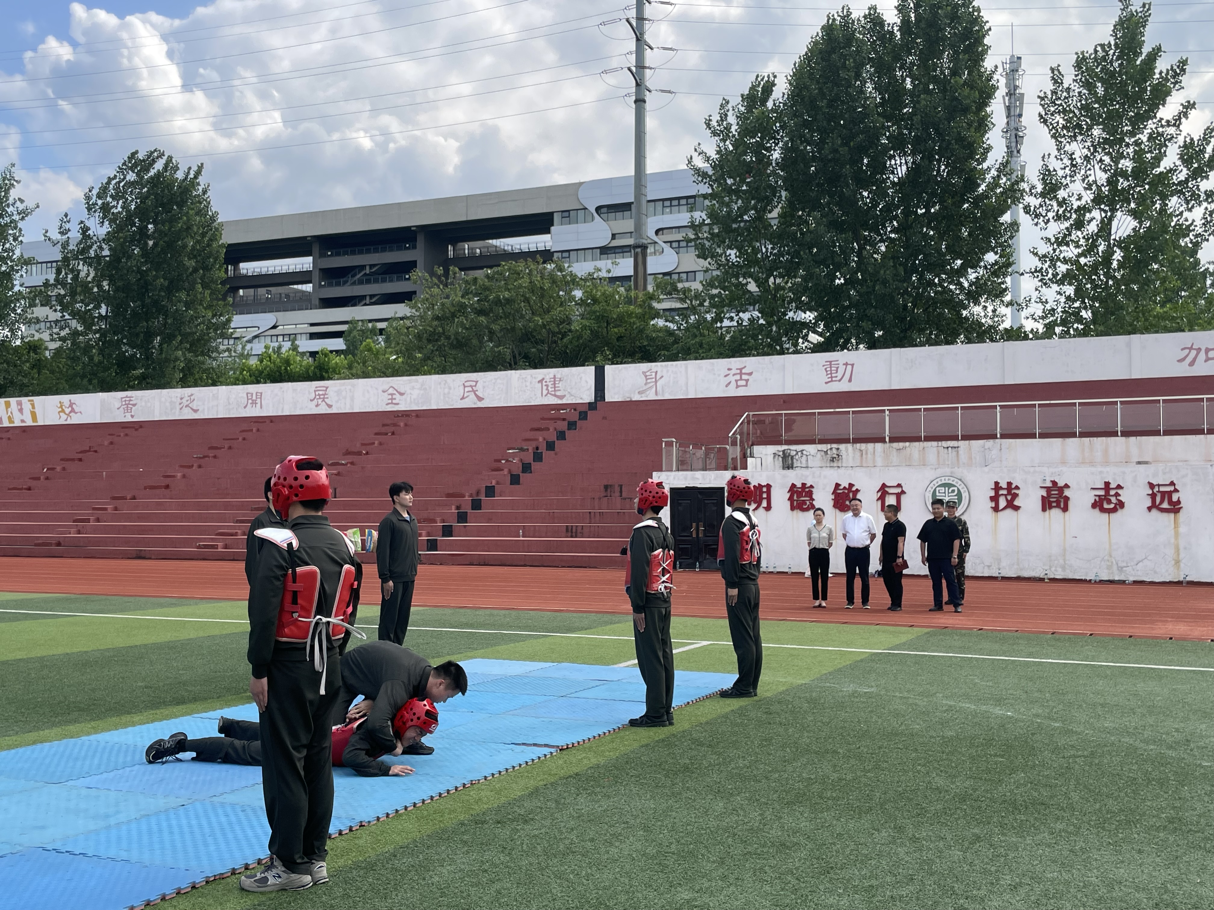 下午,何锐走进田径场参加经济贸易系退役士兵“退伍不褪色,军事技能比武”活动。同学们通过叠军被、分组战术演练及格斗比武展示了他们军人的本色,展现了良好军事素养和组织协作能力。何锐在观摩后对同学们的饱满热情和高昂斗志表示认可,对同学们的训练成果进行了点评,并鼓励同学们继续发扬不怕苦、不怕累的精神,做到退伍不褪色,努力学习,为学院增光添彩。