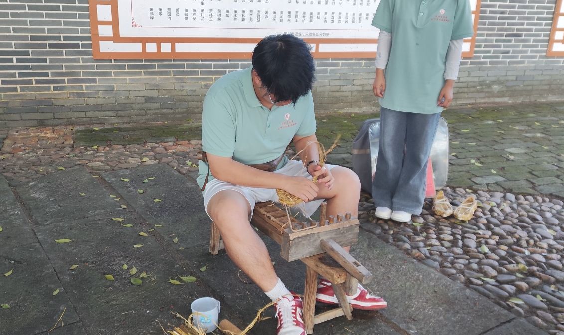 “在长征途中,红军战士穿着一双草鞋,坚定地踏过了万里长征的艰难路程。”肖南斗师傅以丰富的经验和深厚的文化底蕴详细向大家讲解编草鞋的历史和文化背景。“一系一搓一挽一编一压一敲,你拉我绕,草鞋轻松编。”六字决道尽草鞋的制作过程可谓知易行难。草鞋编织不易,长征更是艰辛,在学编草鞋的过程中,队员们也真切的感受了红军战士不畏爬雪山过草地,坚不可摧的理想信念。