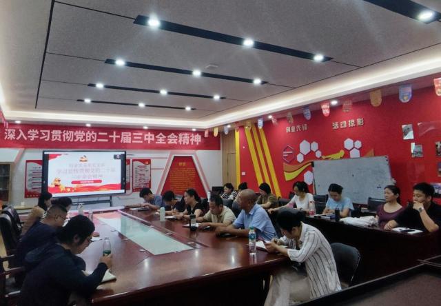 7月24日,经济贸易系在芳泽楼318会议室组织全体教职工传达学习贯彻党的二十届三中全会精神,经济贸易系党支部书记何静主持会议并讲话。