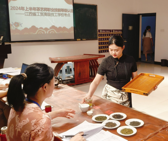 考试分为理论考试和技能考试,为确保此次职业技能等级认定工作顺利进行,我院精心组织,考前培训,做足准备。本次技能认定分为茶事推介、茶具识别、茶样识别、茶艺展示四个环节。认定工作期间,全体考务人员和考评人员履职尽责,严格按照考试规程对学生进行考核,考试秩序井然,考风考纪良好,圆满完成了茶艺师职业技能等级认定工作。