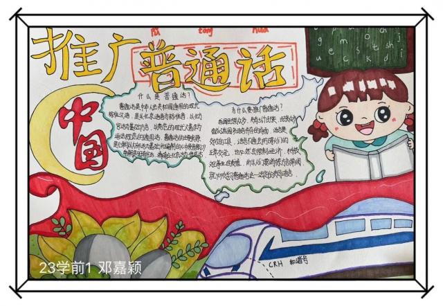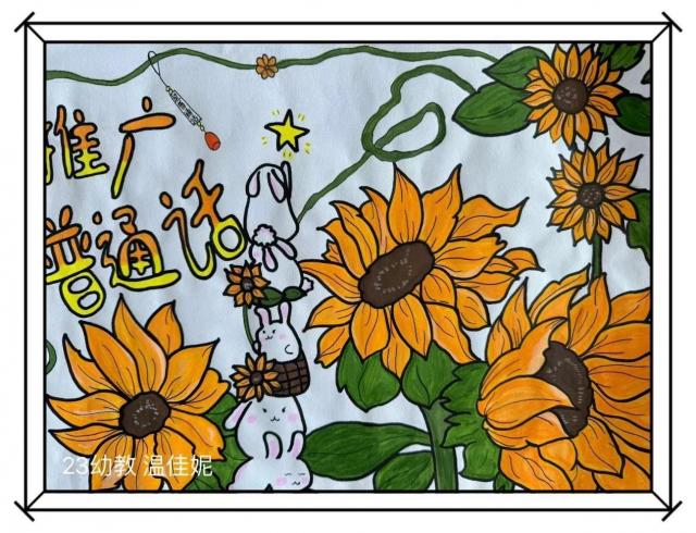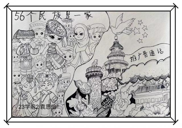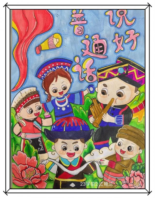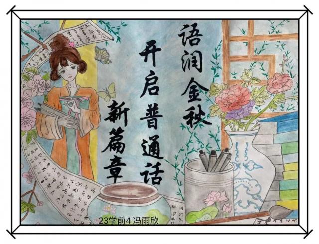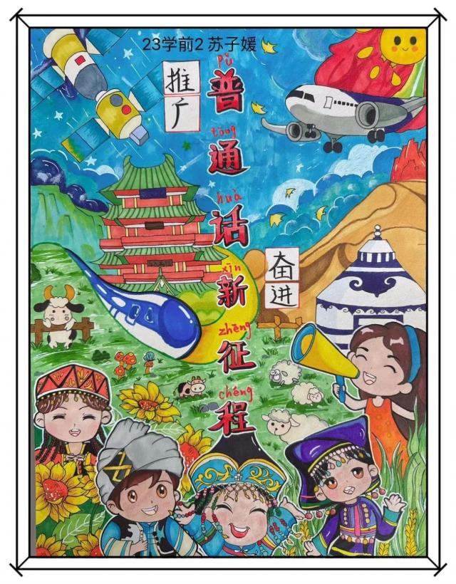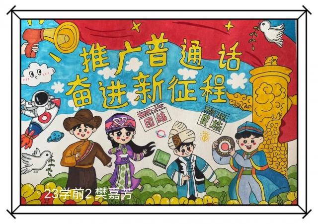 本次活动由高婷老师组织,旅游商务系学前和幼教专业在校学子们全员参与。他们以“加大推普力度,筑牢强国语言基石”为主题,充分发挥自身创作、书法及绘画能力,用充满创意的形式表达对推广普通话的强烈意识。