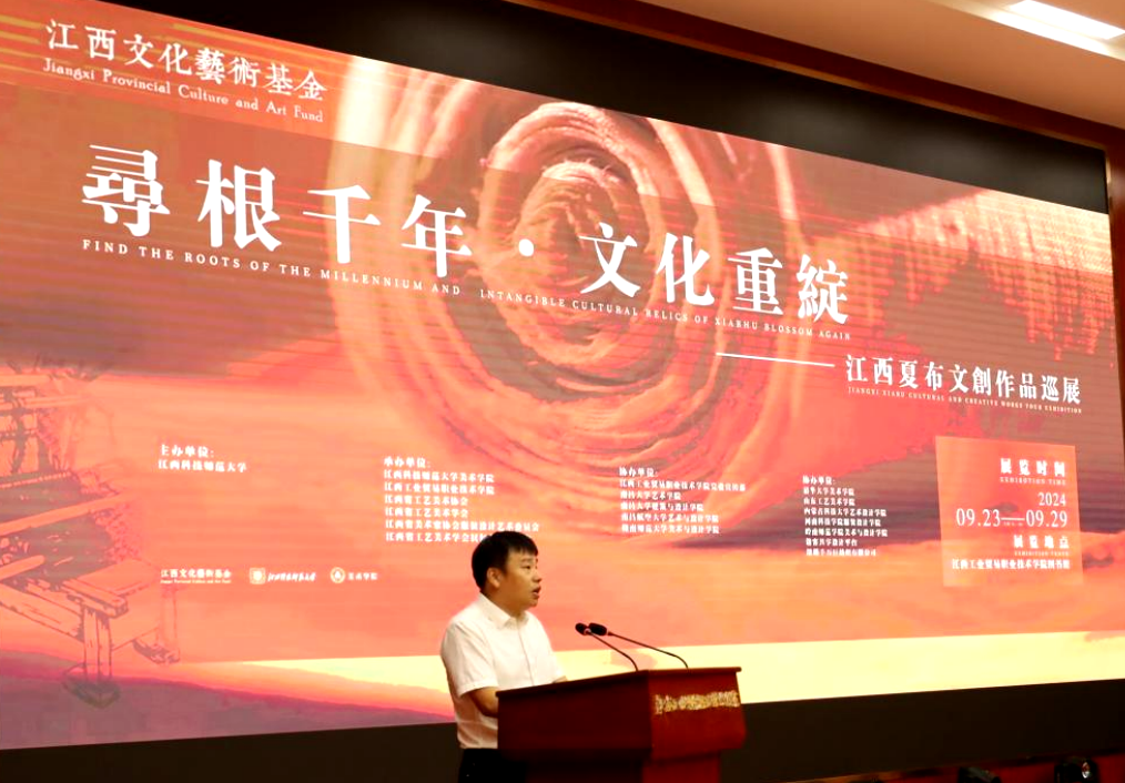 宋小兵在致辞中,代表学院向辛勤筹备此次活动的全体工作人员表示感谢,向出席此次开幕式的各位领导、各位来宾表示热烈的欢迎,并简要介绍了学院概况。宋小兵表示,夏布文化根植于农耕文化,是优秀传统文化样态的重要组成部分,是新时代文化创造的优质载体。宋小兵称赞这些展品不仅展现了夏布技艺的精湛与独特,更蕴含了丰富的文化内涵与创新精神,展现了对美的独特追求与深刻理解。并感谢展览为学院学生带来了沉浸式互动体验,提供了了解夏布文化及相关文创作品的机会。希望通过此次活动,学院同江西科技师范大学美术学院不断加强交流学习,共同搭建展示师生才艺的平台,营造良好的文化育人氛围。