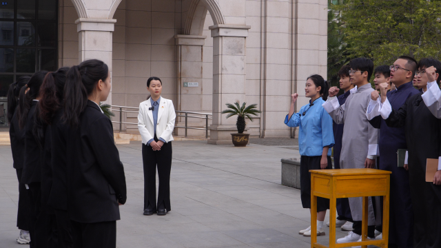 在实践教学环节,张培莹老师与学生同台演绎,经典再现了中国共产党第一次全国代表大会第六次会议的场景,与革命先辈进行跨越时空的对话。