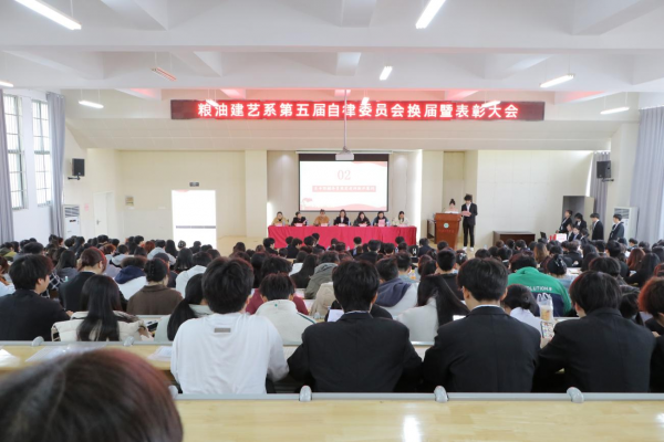 为全面总结过去一年自律委员会工作,听取上一届的工作报告,同时也将选举产生第五届自律委员会会长团,挖掘有能力,有理想,追求全面发展的优秀学生,让同学们进一步获得锻炼自我,展现能力,服务师生的舞台,粮油建艺系于12月5日13:00在志学楼505举行第五届自律委员会换届暨表彰大会,系党支部副书记、学工副主任徐春根,系学管员陈欢,系团总支书记赵思颖,系专职辅导员熊莉、龚晨慧、蔡娅褀、聂慧芬、熊春兰,系自律委员会各部门代表,各系学生干部代表,23、24级学生代表等300余人参加大会。