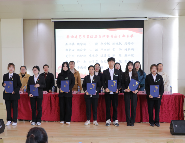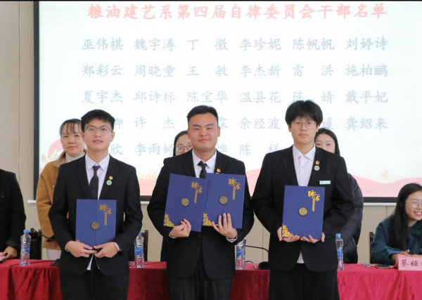 会上,龚晨慧宣读了《关于聘任粮油食品系·建筑与艺术设计系第四届自律委员会干部的决定》;蔡娅褀宣读了《关于表彰粮油食品系·建筑与艺术设计系第四届自律委员会优秀学生干部的决定》。到场领导、老师分别为第四届全体自律委员会干部、优秀学生干部颁发了聘书和荣誉证书。