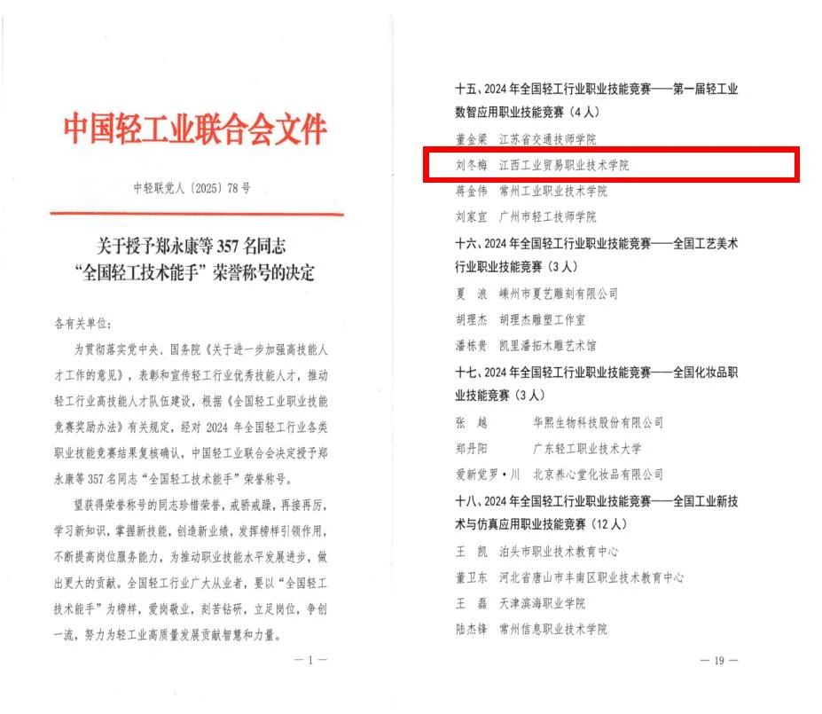 2025年4月24日上午,2025年全国行业职业技能竞赛——第六届轻功大赛动员大会暨全国轻工业行业裁判员培训在浙江杭州举办。其中,机电工程系工业机器人专业教师刘冬梅凭借在“2024年全国轻工行业职业技能竞赛--第一届轻工业数智应用职业技能竞赛”中的沉稳表现,斩获职工组一等奖,荣获“全国轻工技术能手”称号。此次竞赛聚焦人工智能技术在轻工业场景的深度应用,涵盖大模型开发、工业图像检测、数据预测建模等五大技术模块,刘冬梅老师以技术创新与实践能力脱颖而出。