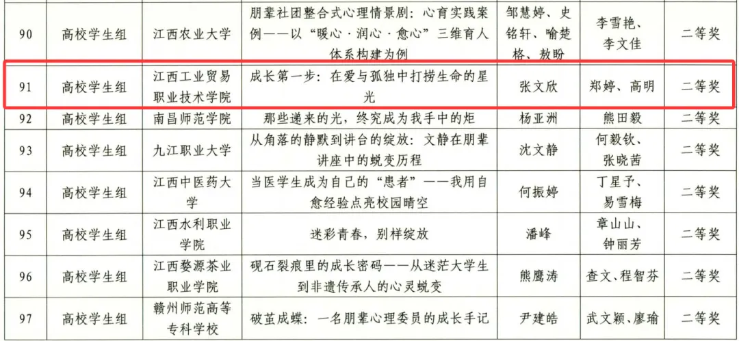 心理健康教育优秀案例评选(高校学生组)荣获二等奖