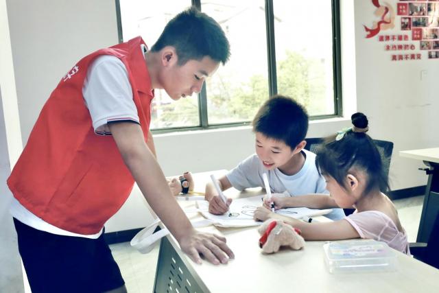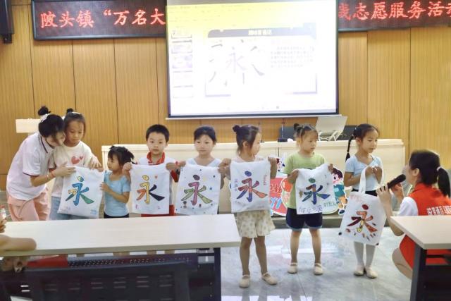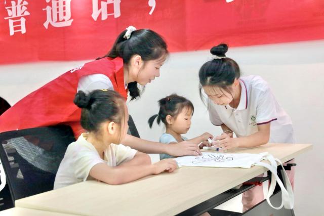 随后,队员们开设普通话推广专题课堂。课程以基础绕口令训练切入主题,强化语音规范性认知。实践队员指导儿童在定制帆布袋上进行填色创作。动手实践环节将抽象的汉字结构与具体形象相结合,加深了儿童对汉字形义的直观理解与记忆,学习文明用语及了解中国汉字的博大精深,使“永”字承载的文化内涵更加生动可感。