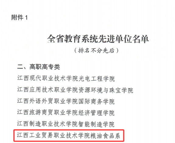 2025年9月4日,江西省教育厅、省人社厅联合发布表彰决定,江西工业贸易职业技术学院粮油食品系获评“全省教育系统先进集体”。