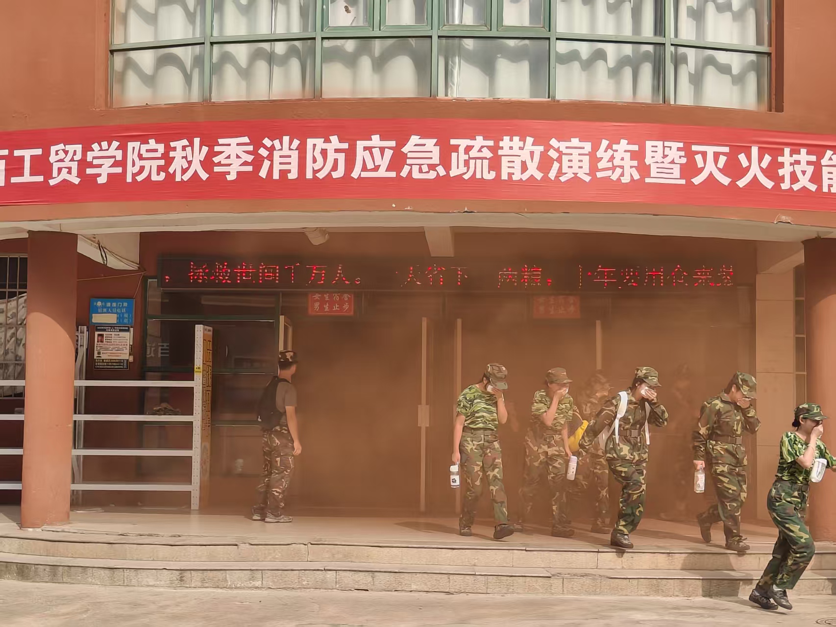 理论讲解结束后,演练进入实战环节。在教官的专业指导下,新生分组上阵,将理论知识转化为实操能力,在“真场景、真体验”中掌握“保命技能”。随着模拟烟雾弥漫、火警警报响起,新生们在引导员的指引下,立即用湿毛巾捂住口鼻,弯腰低姿沿墙壁快速有序撤离,在规定时间内全部抵达指定安全区域,熟练掌握紧急情况下的逃生路线与自救方法。