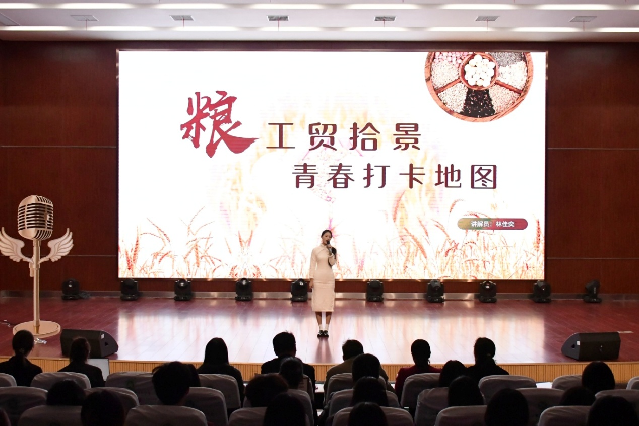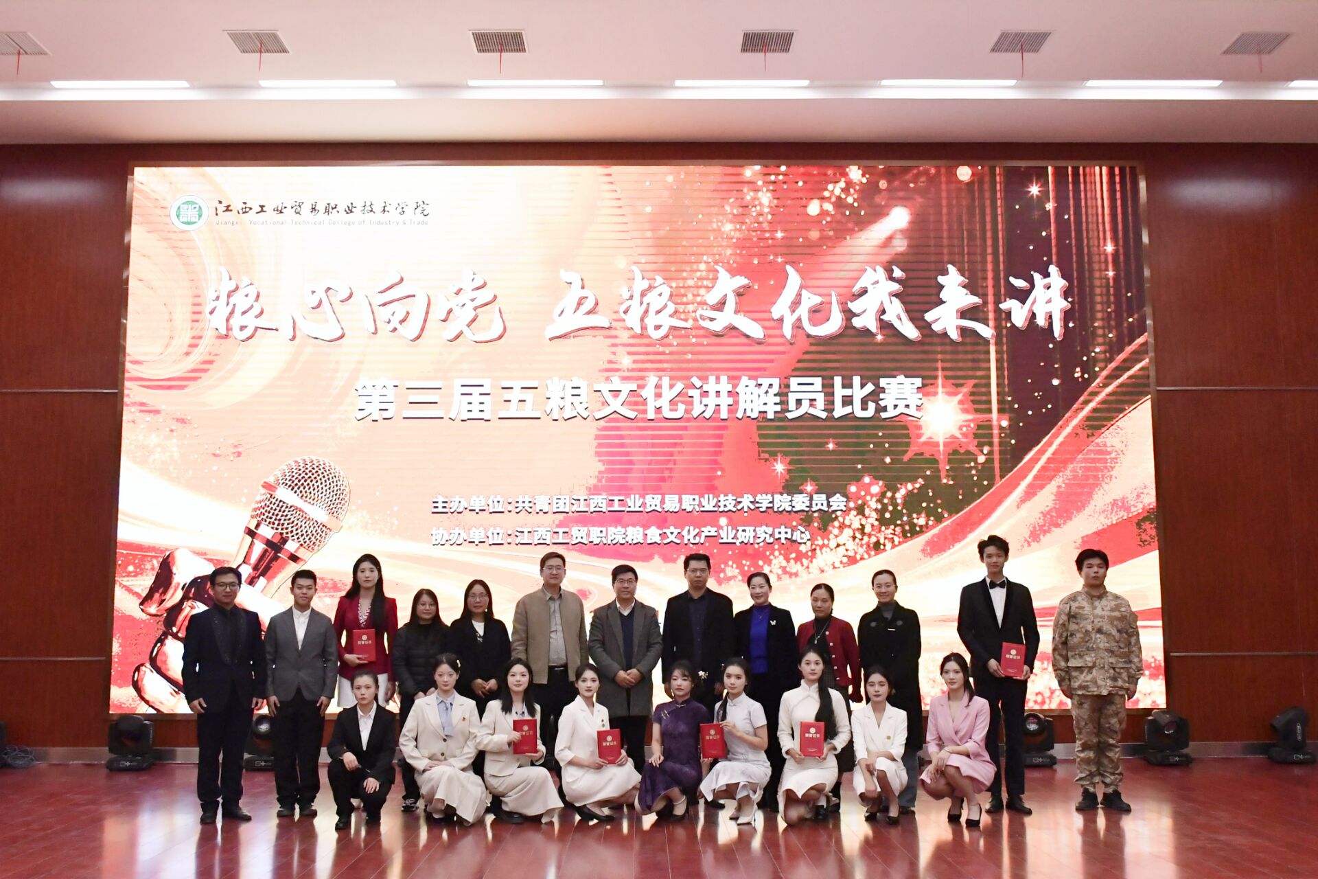 2025年11月27日晚,江西工贸职院学术报告厅内掌声雷动,备受瞩目的“粮心向党 五粮文化我来讲”第三届五粮文化讲解员比赛在此落下帷幕。此次活动由院团委主办,粮食文化产业研究中心承办,学院党委副书记、院长朱迎强出席本次活动,学生工作处处长罗卫兵、粮食文化产业研究中心主任李尊华、招生处旷聿涵老师、学院办公室刘逍潇老师、党委办公室谢雨蓉老师担任此次比赛评委,经过激烈角逐,13名决赛选手用青春之声诠释粮食文化魅力,展现了新时代青年传承中华优秀传统文化的责任与担当。