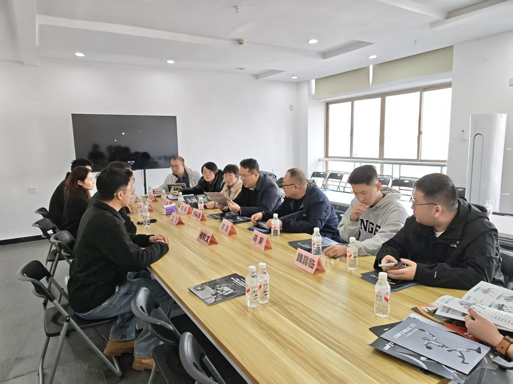 在宇树科技股份有限公司座谈期间,调研团队及企业双方聚焦职业教育相关的职教人才培养体系建设、课程共建、实训基地合作建设等方面内容展开深入讨论。万晓波介绍了学院在工业机器人技术专业群建设方面的建设现状和特色优势,期望能以此次调研为契机,与企业在课程开发、实训基地建设、技术服务等方面开展多维度、深层次的合作,共同探索“专业共建、人才共育、过程共管、成果共享”的深度产教融合机制。宇树科技对学院以需求为导向推进专业群建设,促进学院产教融合的入企调研行动予以高度评价。